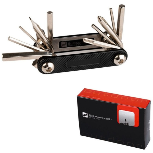 Практичный набор инструментов для байкеров. Включает в себя многофункциональный инструмент для ремонта велосипеда и петлю. Упакован в коробку Schwarzwolf.