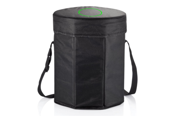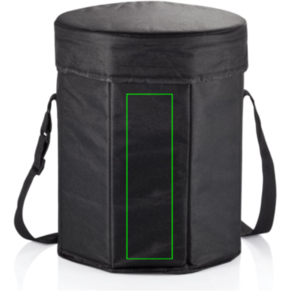 Полиэстер 600D черного цвета с полиэтиленовым покрытием, диаметр 30 см, складной. Можно использовать как охладитель и сиденье.