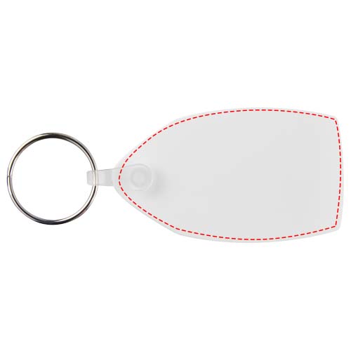 Брелок белого цвета прямоугольной формы с металлическим разъемным кольцом для ключей. Металлическая петля для крепления кольца представляет собой плоский профиль, что делает его идеальным для пересылки.