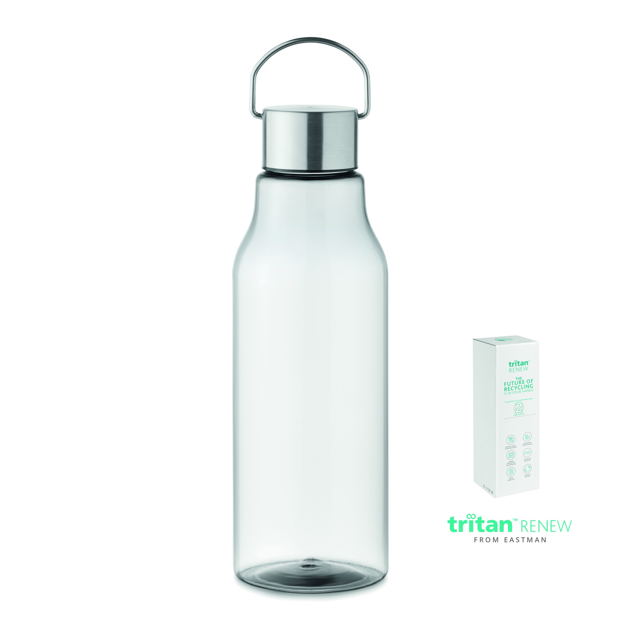 Бутылка для питья из тритана, не содержащего BPA, с крышкой из нержавеющей стали. Герметична. Емкость 800 мл. Этот продукт на 50% состоит из переаботанных отходов пластика с использованием сертификата ISCC.