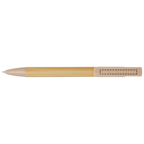 Бамбуковая шариковая ручка, которая также может служить подставкой для телефона. Кнопка и среднее кольцо изготовлены из переработанного пластика, наконечник — из латуни, а корпус — из бамбука, полученного из ответственных источников. Цвет чернил: синий. Длина непрерывной линии: 1000 метров. Размер пера: 1,0 мм.