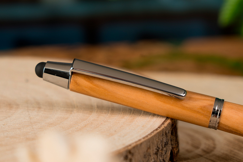 Шариковая ручка из оливкового дерева, с функцией сенсорного ввода и синим стержнем. Ваш логотип будет выгравирован под зажимом.
