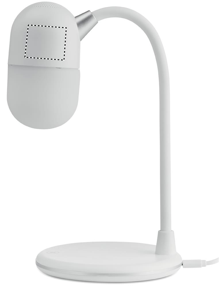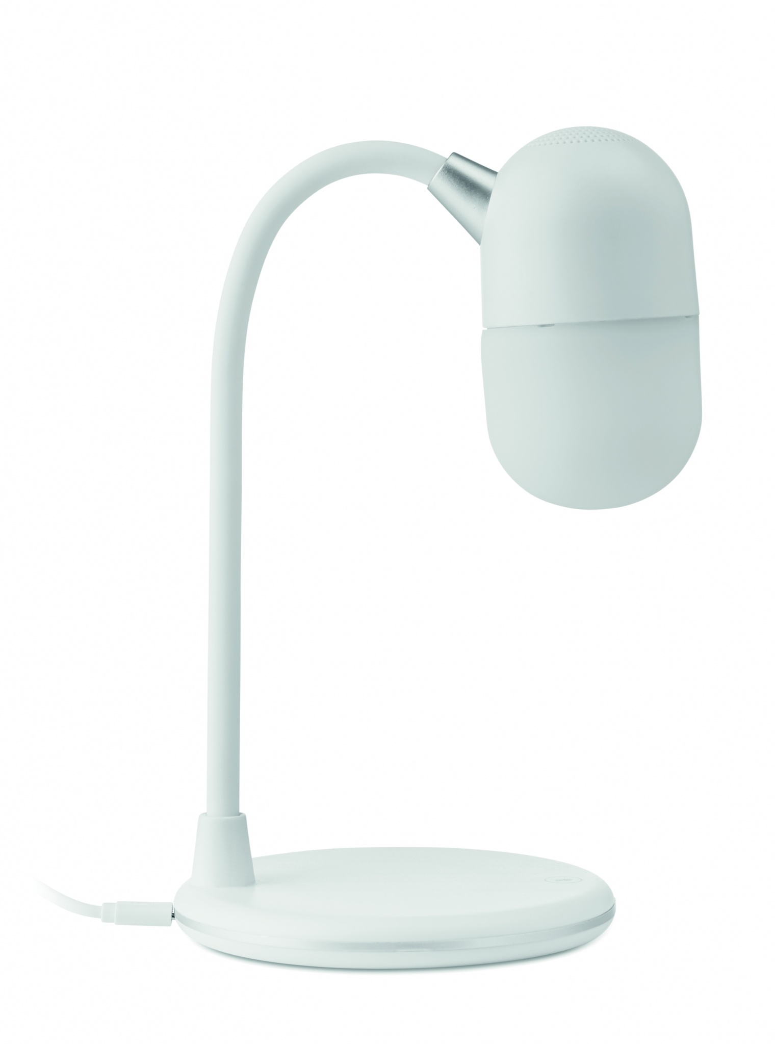 Док станция и настольный светильник с беспроводной колонкой. Лампа имеет 3 режима интенсивности света: дневной свет, холодный свет и естественный свет. Выход: DC5V/1A (5W). Совместимые новейшие андроиды, iPhone® 8, X и новее.