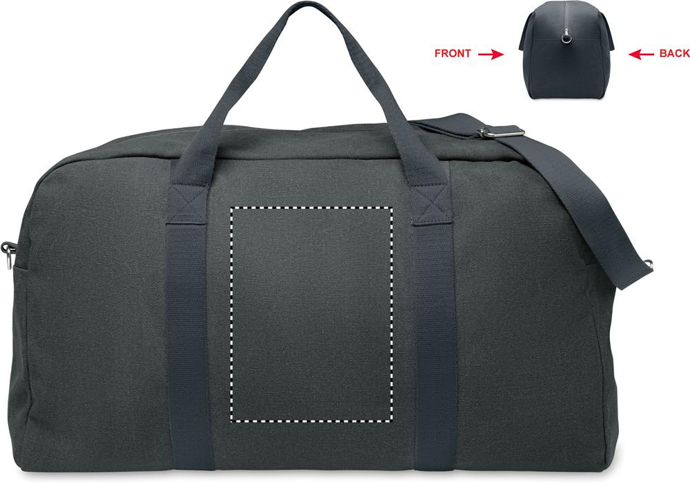 Duffle travel bag in recycled 450 gr/m² fabrics (60% recycled cotton and 40% recycled polyester) with adjustable and detachable cotton strap.