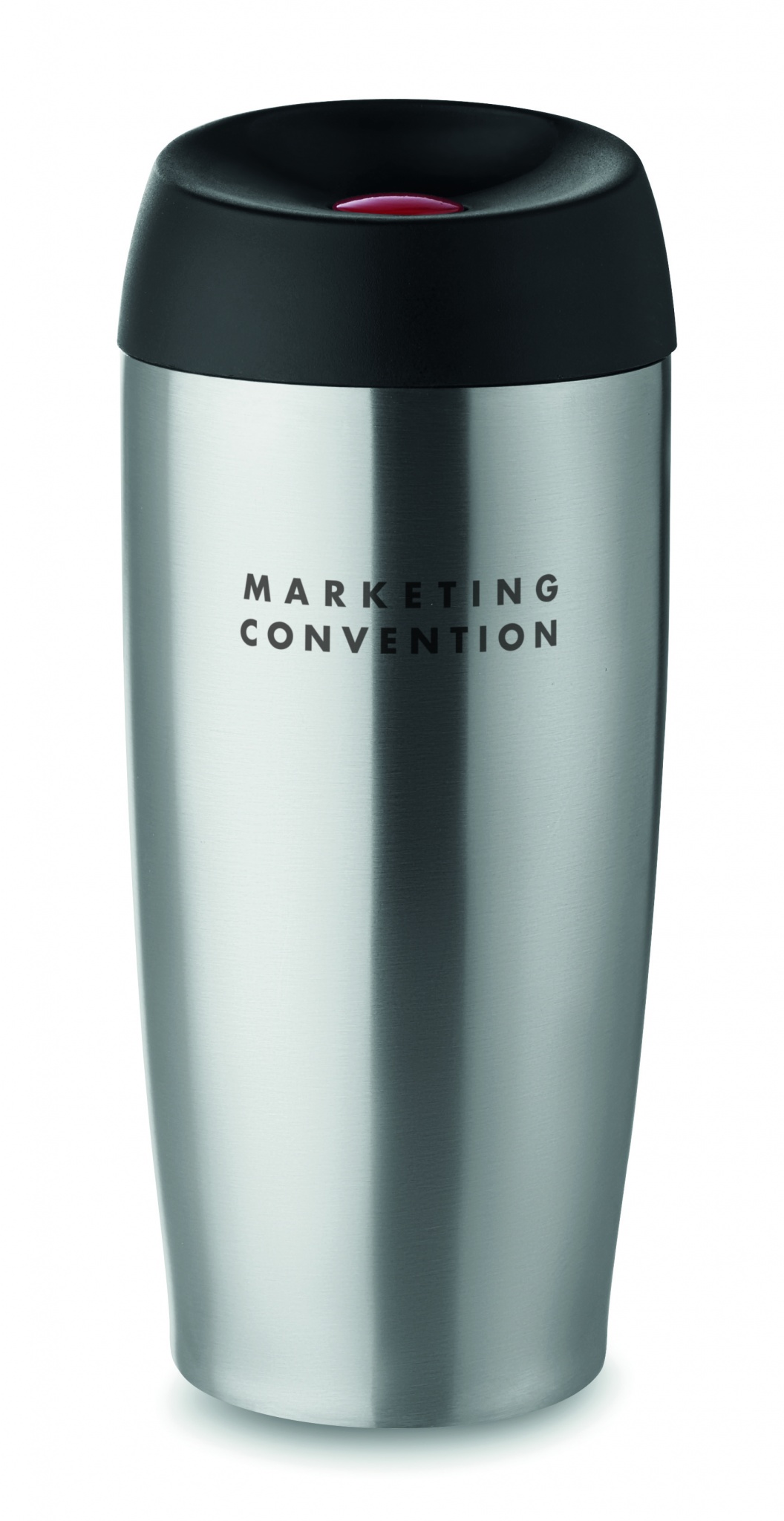 Термокружка с двойными стенками из нержавеющей стали с защищенной полипропиленовой крышкой, открывается кнопкой, гереметична. Колба из нержавейки. Емкость: 350 мл. Не протекает.