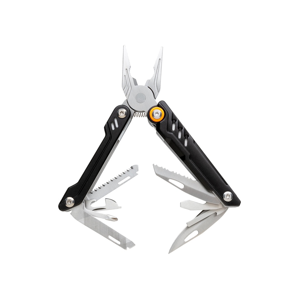 Сверхпрочный инструмент с 13 функциями. Упакован в роскошную подарочную коробку, включая высококачественный чехол 1680D. Корпус из алюминиевого материала и инструменты из нержавеющей стали. В комплект входят: плоскогубцы с длинными носами, стандартные плоскогубцы, кусачки, зубчатое лезвие, открывалка для бутылок, большая плоская отвертка, средняя плоская отвертка, нож, напильник, крестовая отвертка, консервный нож, малая плоская отвертка, пила.