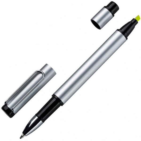 Алюминиевая шариковая ручка с черным стержнем и желтым маркером на противоположной стороне. Мы гравируем ваш логотип на стержне.