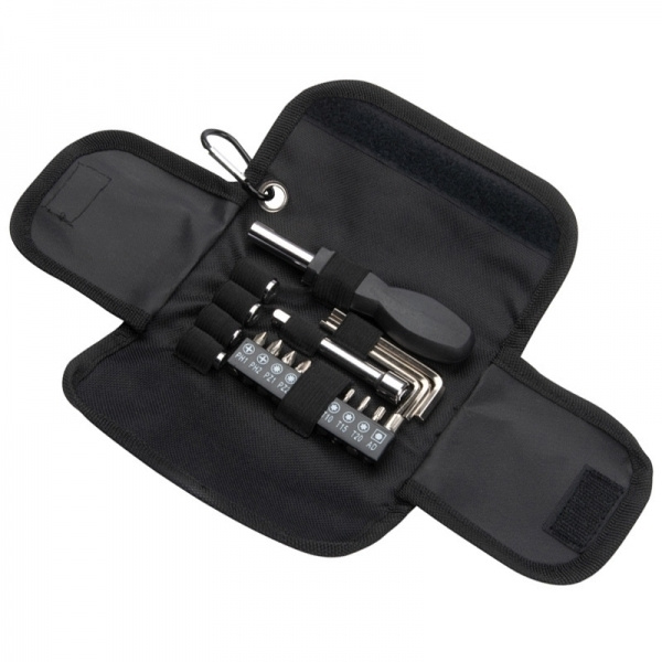 Набор инструментов состоит из отвертки с различными гайками и битами, удлинителя и трех шестигранных ключей разных размеров, а также практичной сумки с карабинами, на которых мы печатаем ваш логотип. Набор индивидуально упакован в полиэтиленовый пакет.