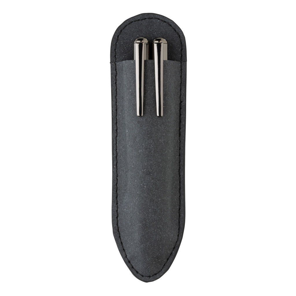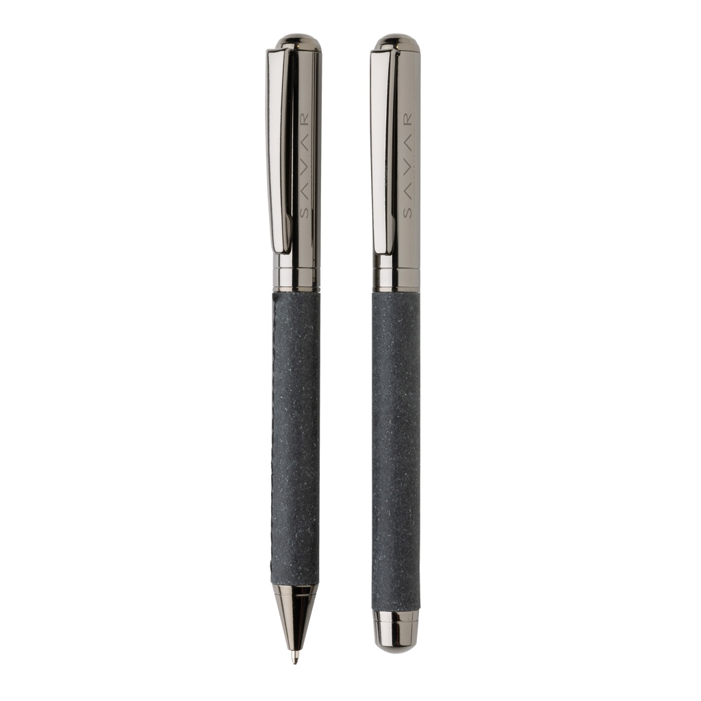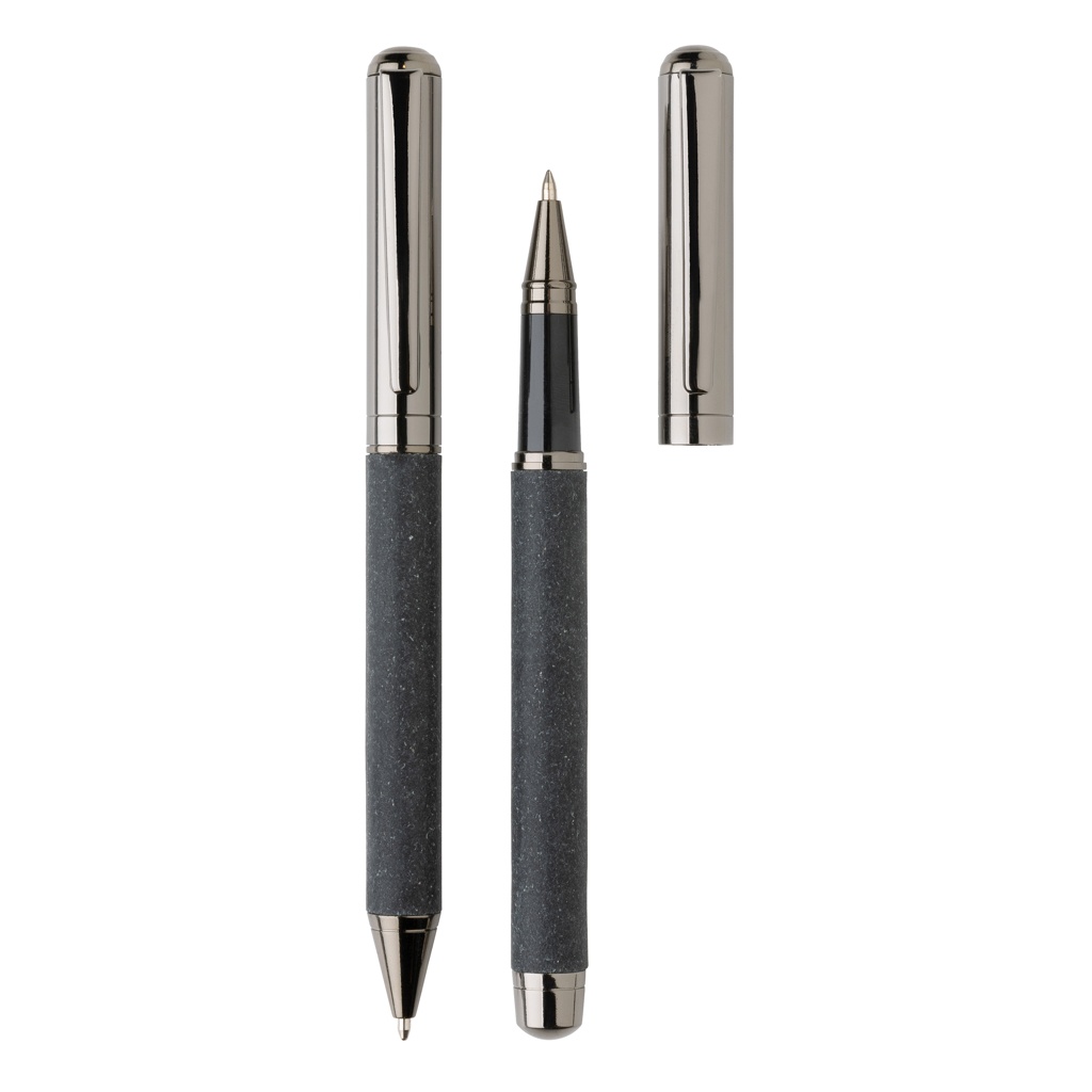 Этот красивый набор ручек изготовлен из переработанной кожи. Набор имеет элегантный дизайн цвета оружейной стали, он стильный и идеально подходит для записи ваших заметок в стиле. Он содержит шариковую ручку и ручку-роллер. Каждая ручка включает синие чернила Dokumental. Длина письма для ручки составляет 1200 метров, а для ручки-роллера — 400 метров. Набор ручек поставляется в чехле из переработанной кожи и подарочной коробке с принтом в виде переработанной кожи.