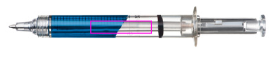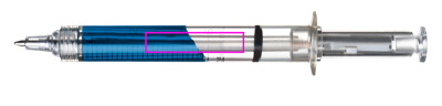 Ручка-кляп в форме шприца, с синим или красным пластиковым стержнем. Мы напечатаем ваш логотип черным цветом напротив шкалы.