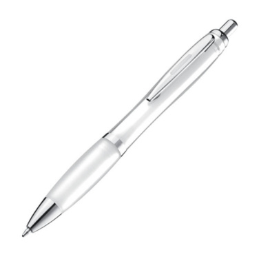 Прозрачная шариковая ручка с мягкой зоной захвата и синим стержнем большой емкости. Мы напечатаем ваш логотип на правой стороне зажима.