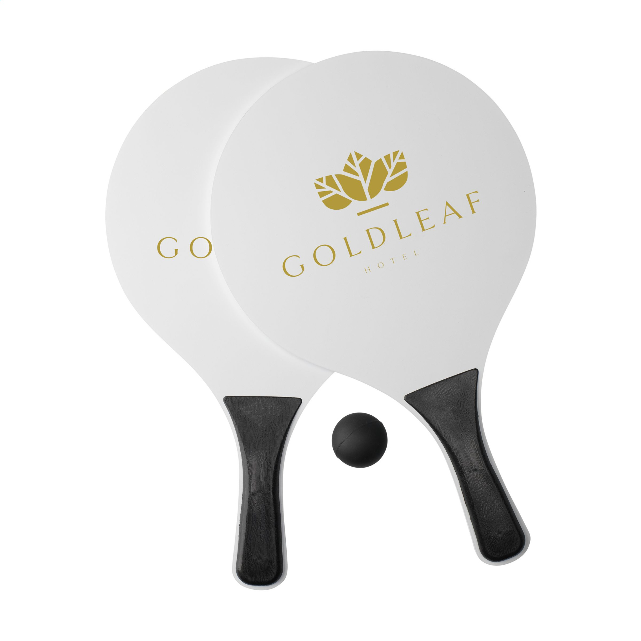Спортивный пляжный набор: 2 ракетки из МДФ с ручками из полипропилена и резиновым мячом. Каждый набор поставляется в сетчатой упаковке.