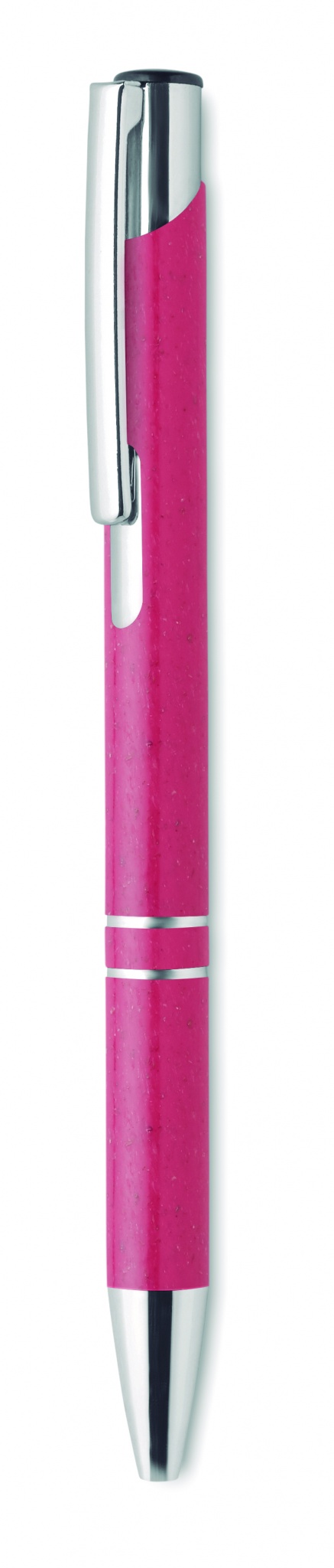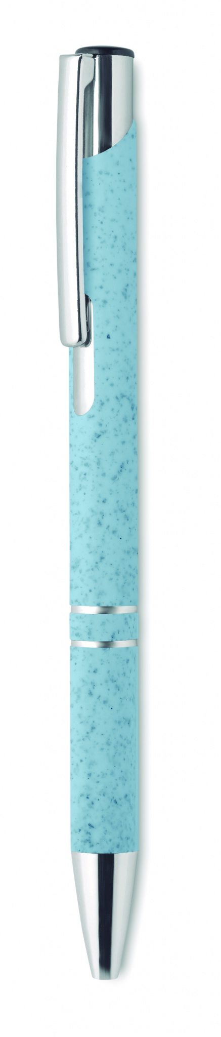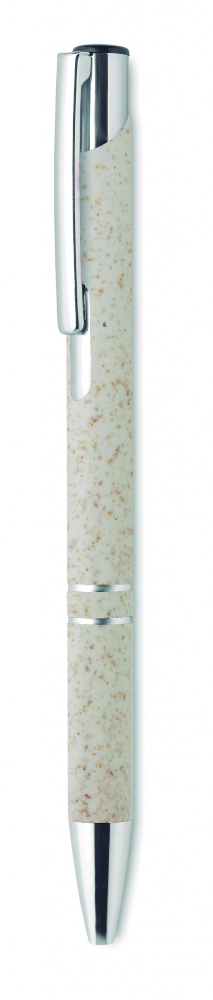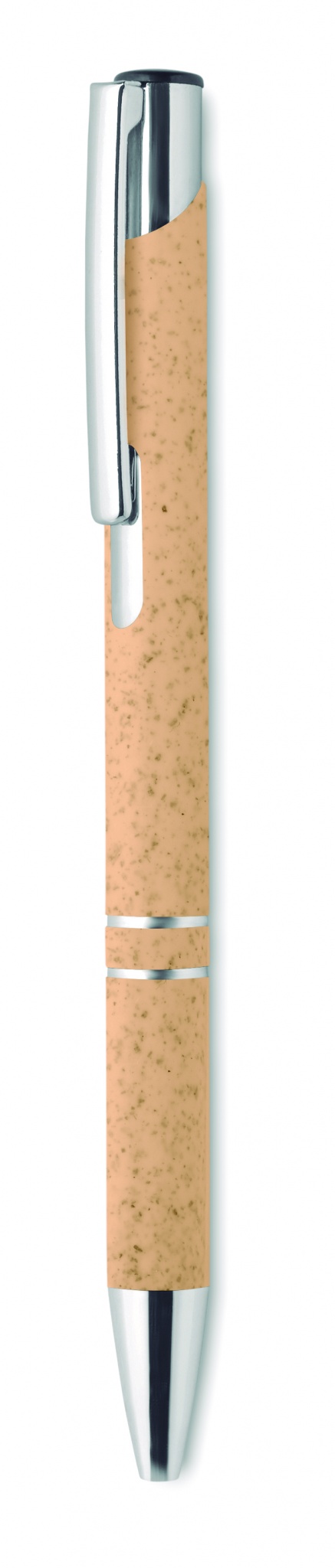 Шариковая ручка, состоящая на 50% из соломы и на 50% из пластика с серебряными вставками. Синие чернила.