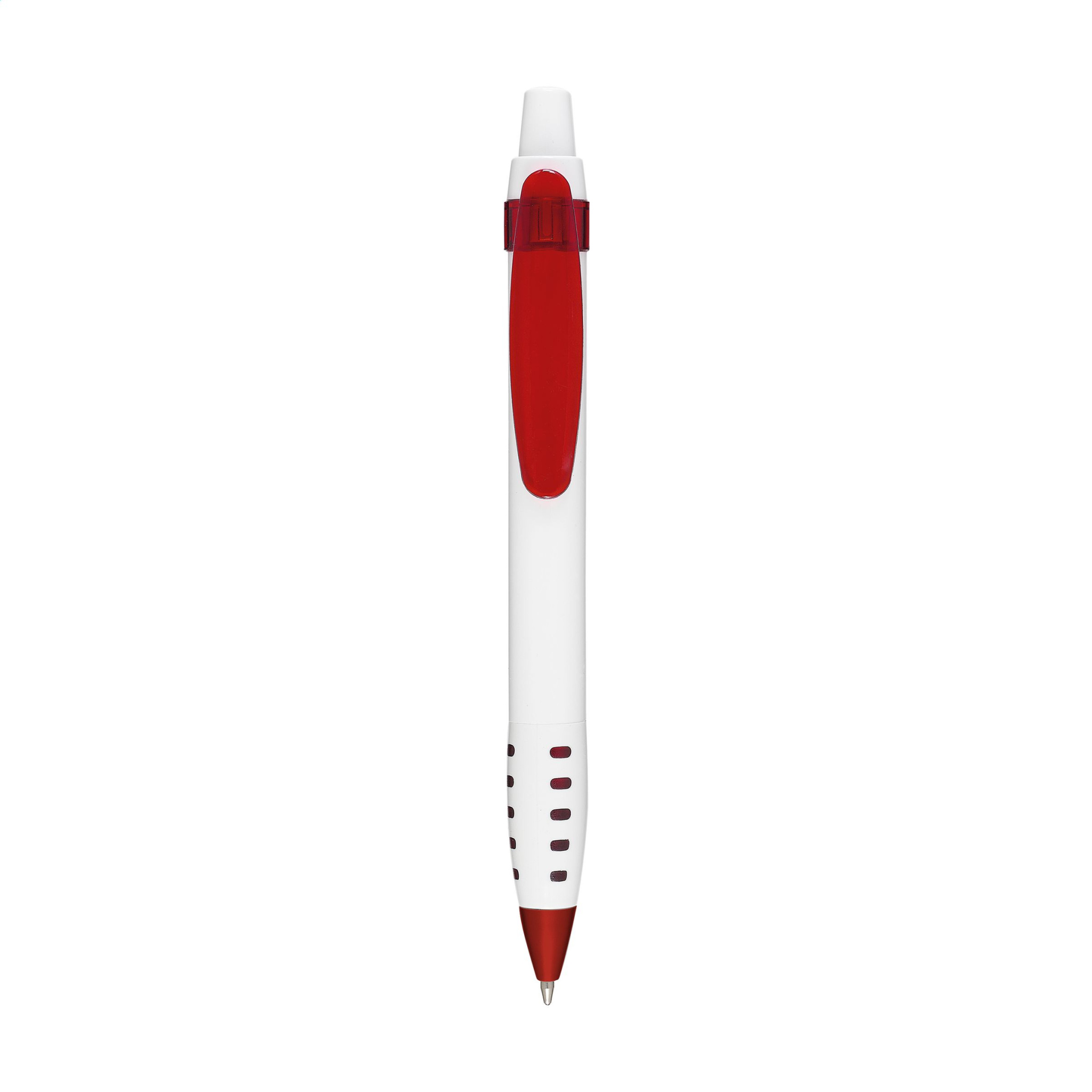 Шариковая ручка с синими чернилами, прозрачным цветным клипом и соответствующим выемчатым элементом на горлышке.