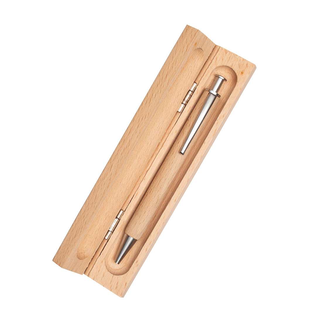 Деревянная шариковая ручка с металлическим стержнем blue-writing system и деревянным корпусом. Лазерная гравировка расположена под зажимом.