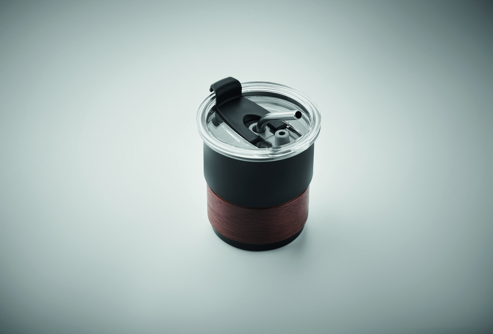 Single wall tumbler in recycled stainless steel (90% recycled stainless steel and 10% stainless steel) with a detachable grip in acacia wood, stainless steel straw. Straw socket and direct drink opening leak-free lid. Capacity: 260 ml.