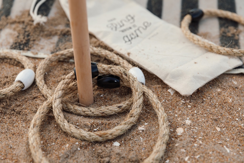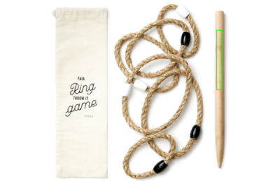 Игра на открытом воздухе, которая одинаково хорошо подходит как для пляжа, так и для парка, упакованная в хлопчатобумажную сумку, которую легко носить с собой. Игра заключается в бросании веревок в форме кругов на палку, которую вы просто прикрепляете к земле. Разные размеры колец дают разное количество очков. Полное руководство по эксплуатации прилагается.