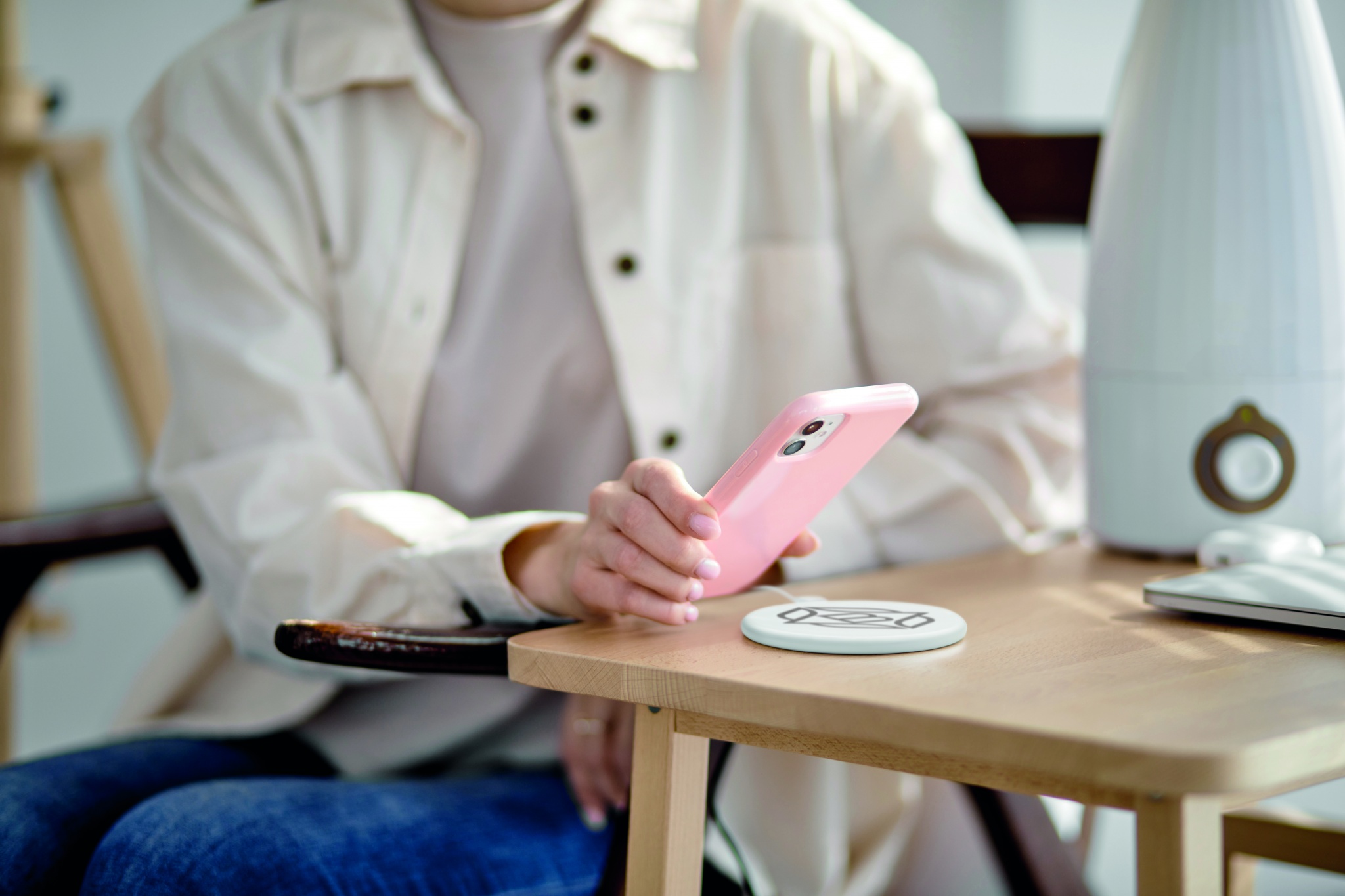 Зарядное устройство беспроводное из переработанного пластика ABS. Выход: 9В AC /1,1А (10 Вт) для быстрой зарядки. Совместимость с последними версиями устройств Android, iPhone® 8, X и новее.