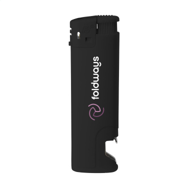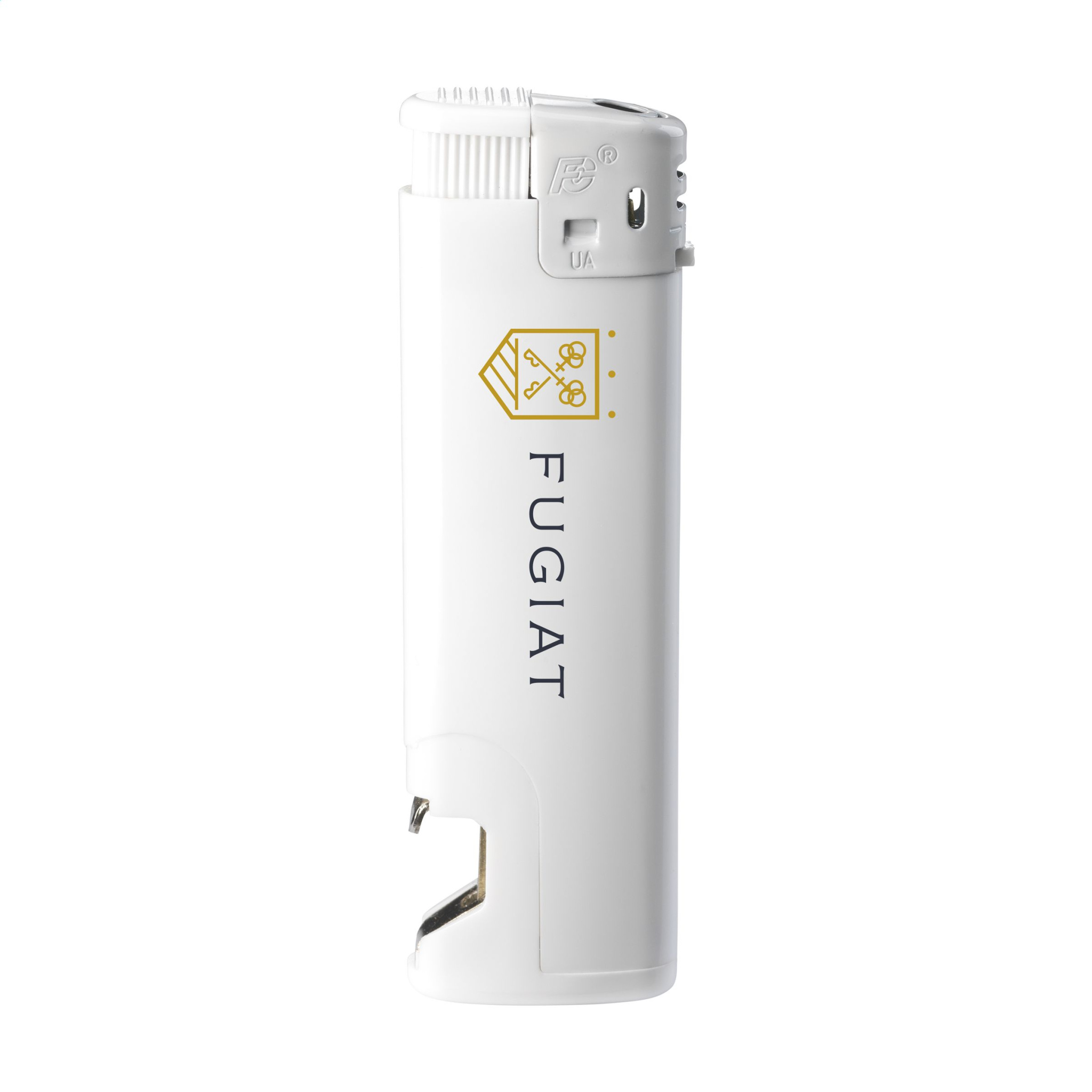 Тонкая электронная зажигалка марки Flameclub® с удобной открывалкой для бутылок и регулируемым пламенем. Заправляемая. Оснащена замком от детей. Сертификация NEN: EN13869. Сертификация TÜV и сертификация ISO: ISO9994. Зажигалки поставляются только с печатью.