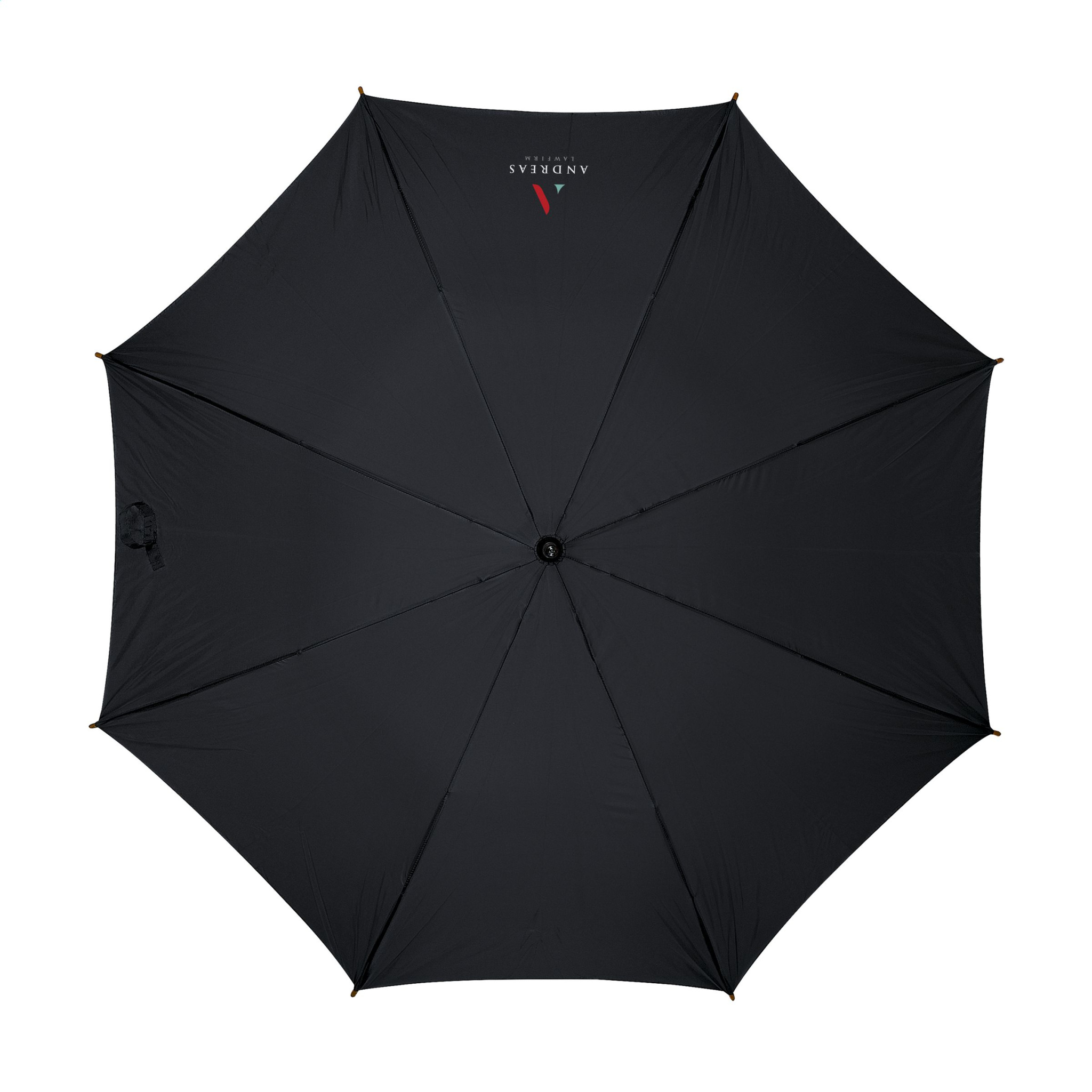Зонт с автоматическим телескопическим раскрытием, куполом из полиэстера плотностью 190T, металлическим каркасом, деревянным стержнем и ручкой, застежкой-липучкой.