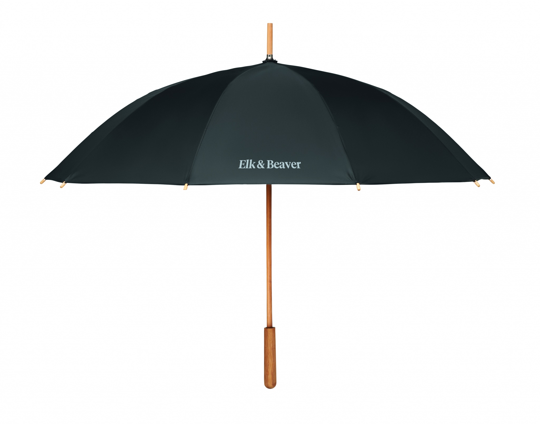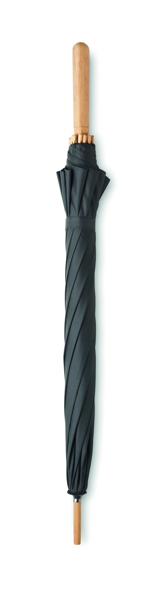 23,5 tums paraply med manuellt öppning/stängning, stormsäkert i 190T RPET-pongematerial med bambusskaft, spetsar och handtag. Naturfärgade glasfiberribbor.