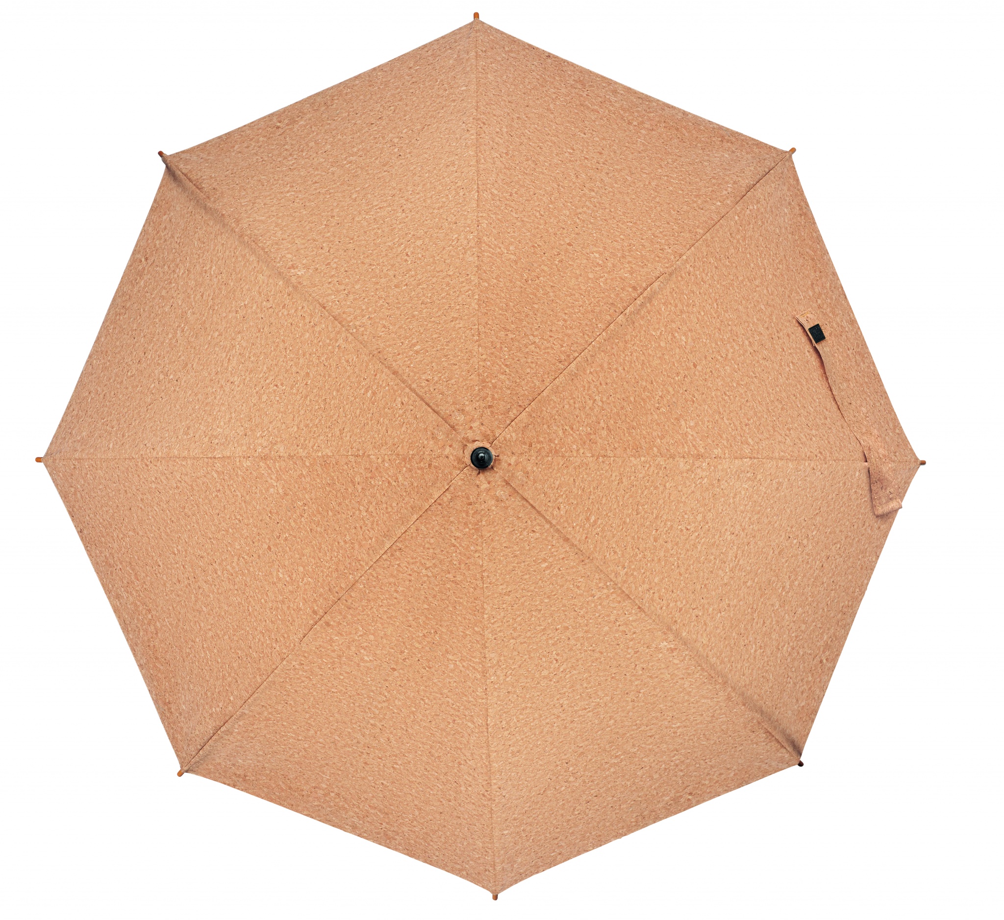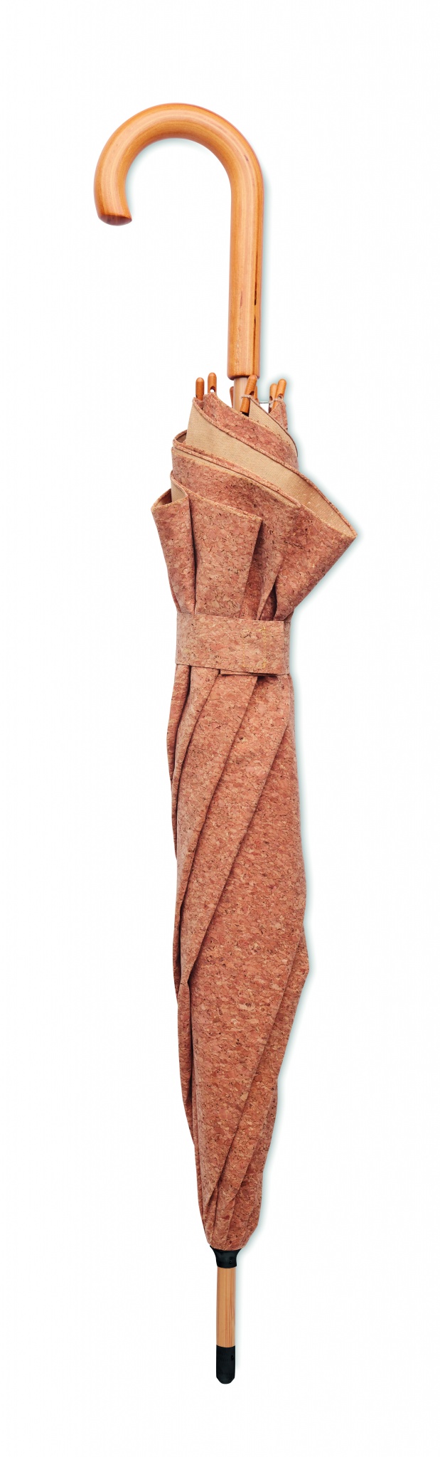 25 tums stormsäkert paraply i kork med automatiskt öppning. Bambuskaft och handtag i plywoodträ, glasfiberribbor och spetsar och topp i svart plast. Manuell stängning.