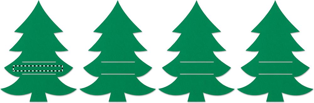 Set med 4st RPET-filtbestickhållare i julgranform i presentkartong av återvunnet papper. Eftersom alla ser fram emot julmiddagen kan dekorationerna vara lika viktiga som maten. Dekorera ditt bord och tallrikar med dsnygga bestickhållare i filt, gjorda av återvunnet PET-material.