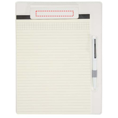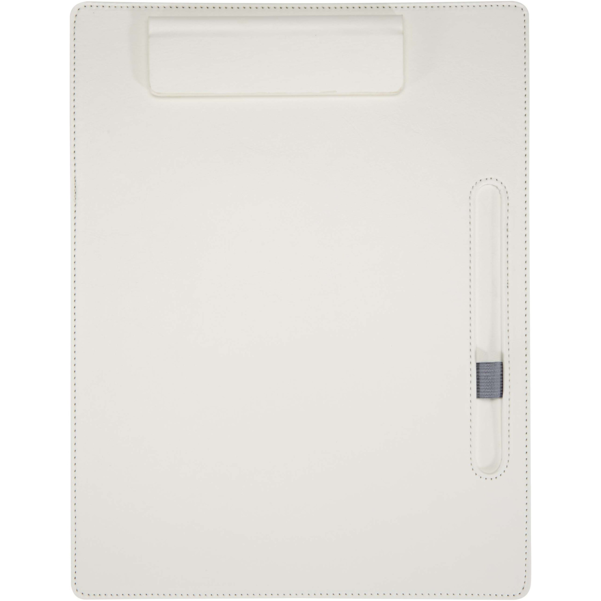 Skrivplattan Clast kombinerar en elegant design i PU-läder med praktiska funktioner för både möten och vardagsbruk. Den passar vanliga A4-sidor och har magnetklämma, sydda kanter och en inbyggd pennögla. Inuti finns 26 linjerade ark med 65 g/m² papper samt en kulspetspenna med en övre hylsa i återvunnen plast och en nedre hylsa i RCS-certifierad återvunnen aluminium. Kulspetspennan Juana finns också tillgänglig separat. Skrivplattans storlek: 25,5 × 33 cm. Pennans bläckfärg: svart.
