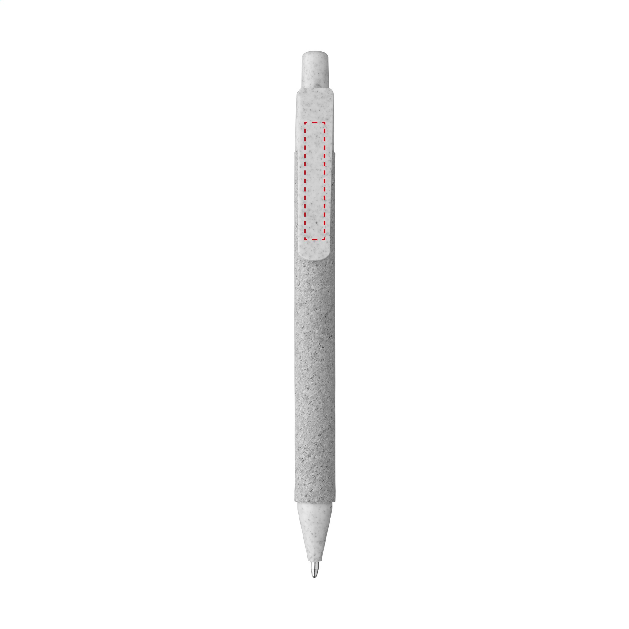 WoW! Kulspetspenna med blått bläck med en tunna av kork. Spetsen, toppen, tryckknappen och klämman är gjorda av 50 % PP och 50 % vetehalm. Delvis biologiskt nedbrytbar.