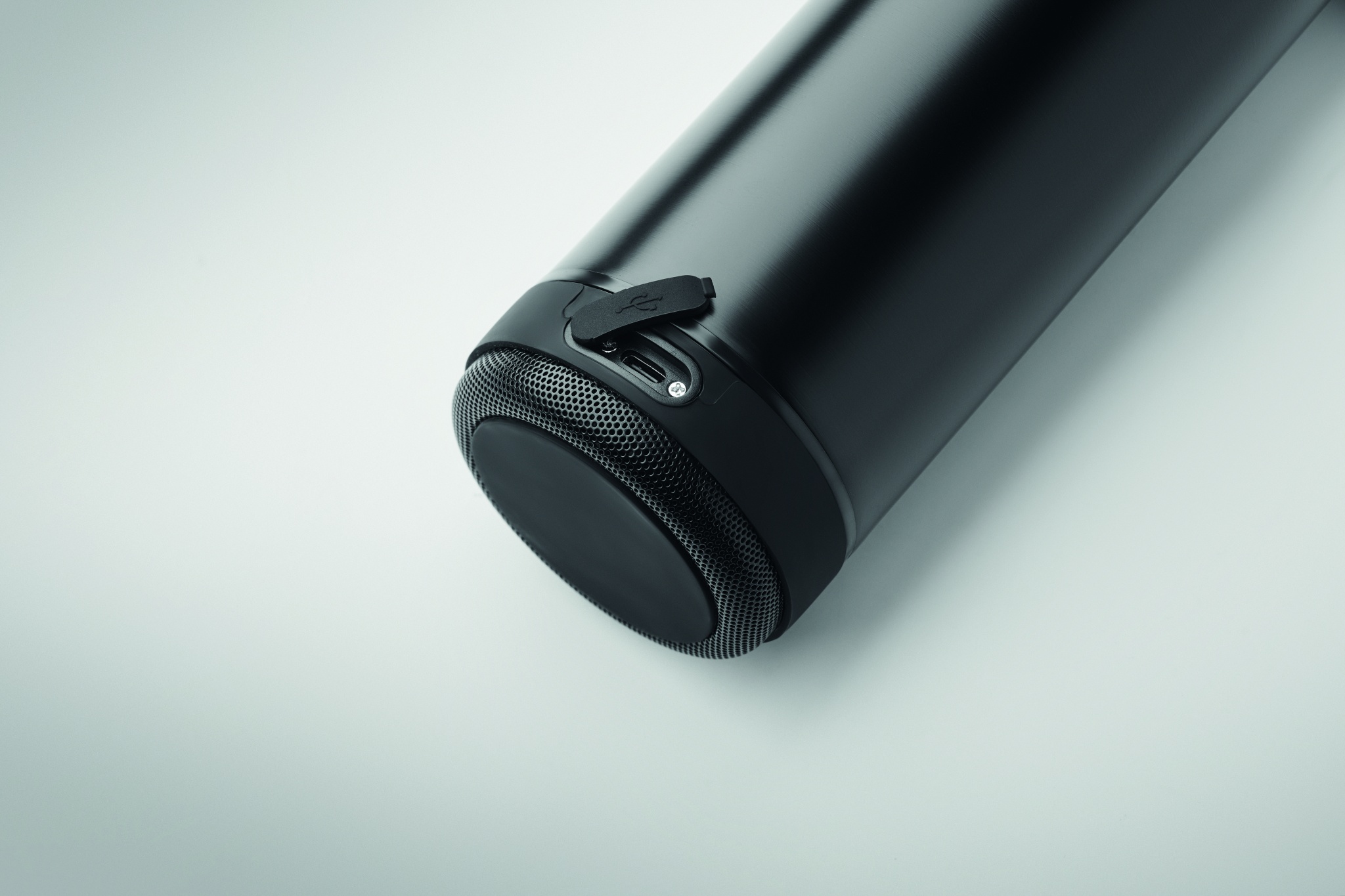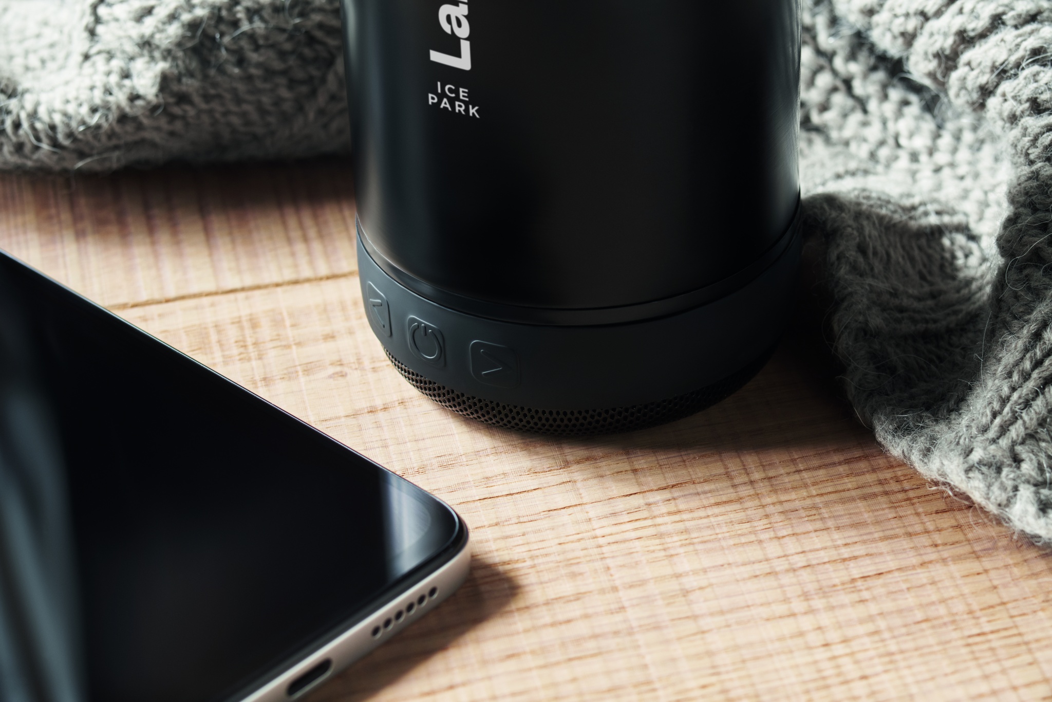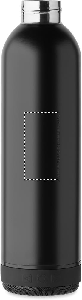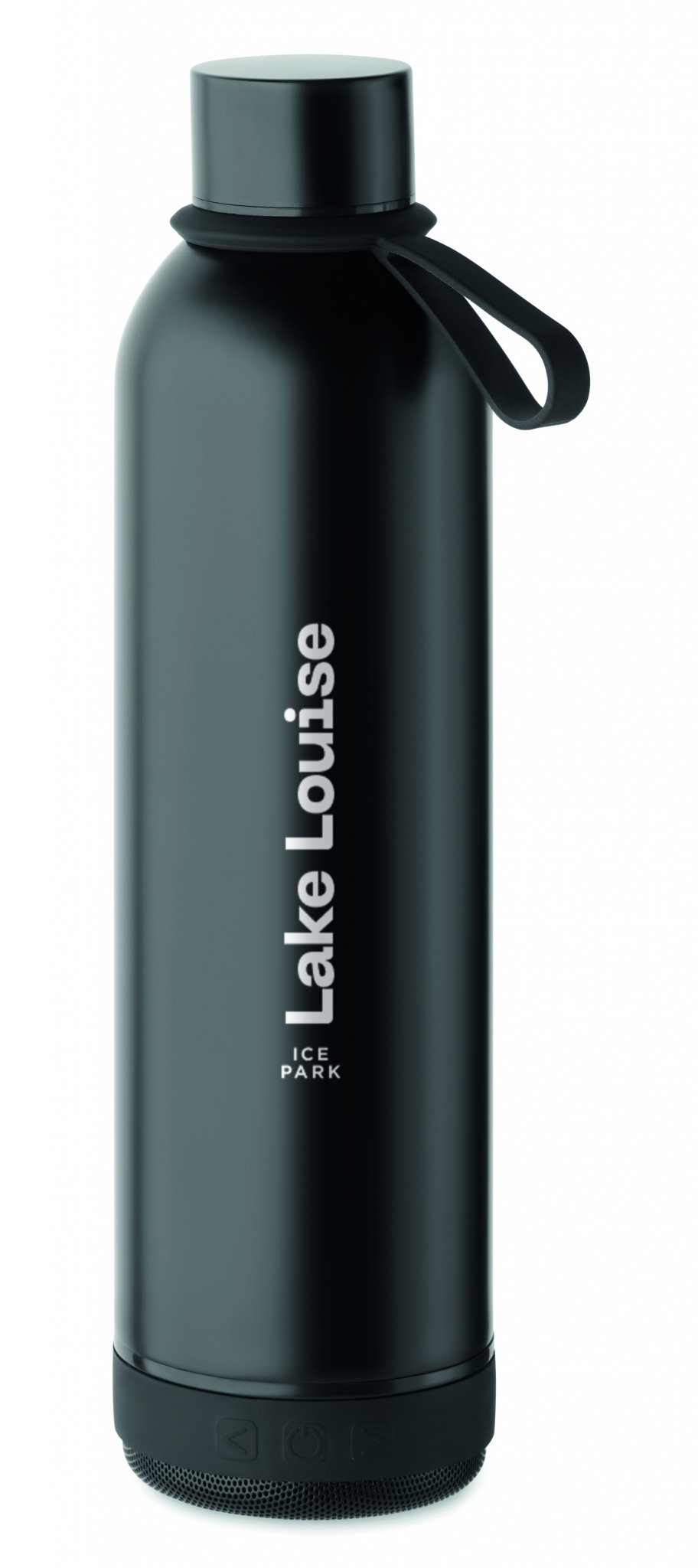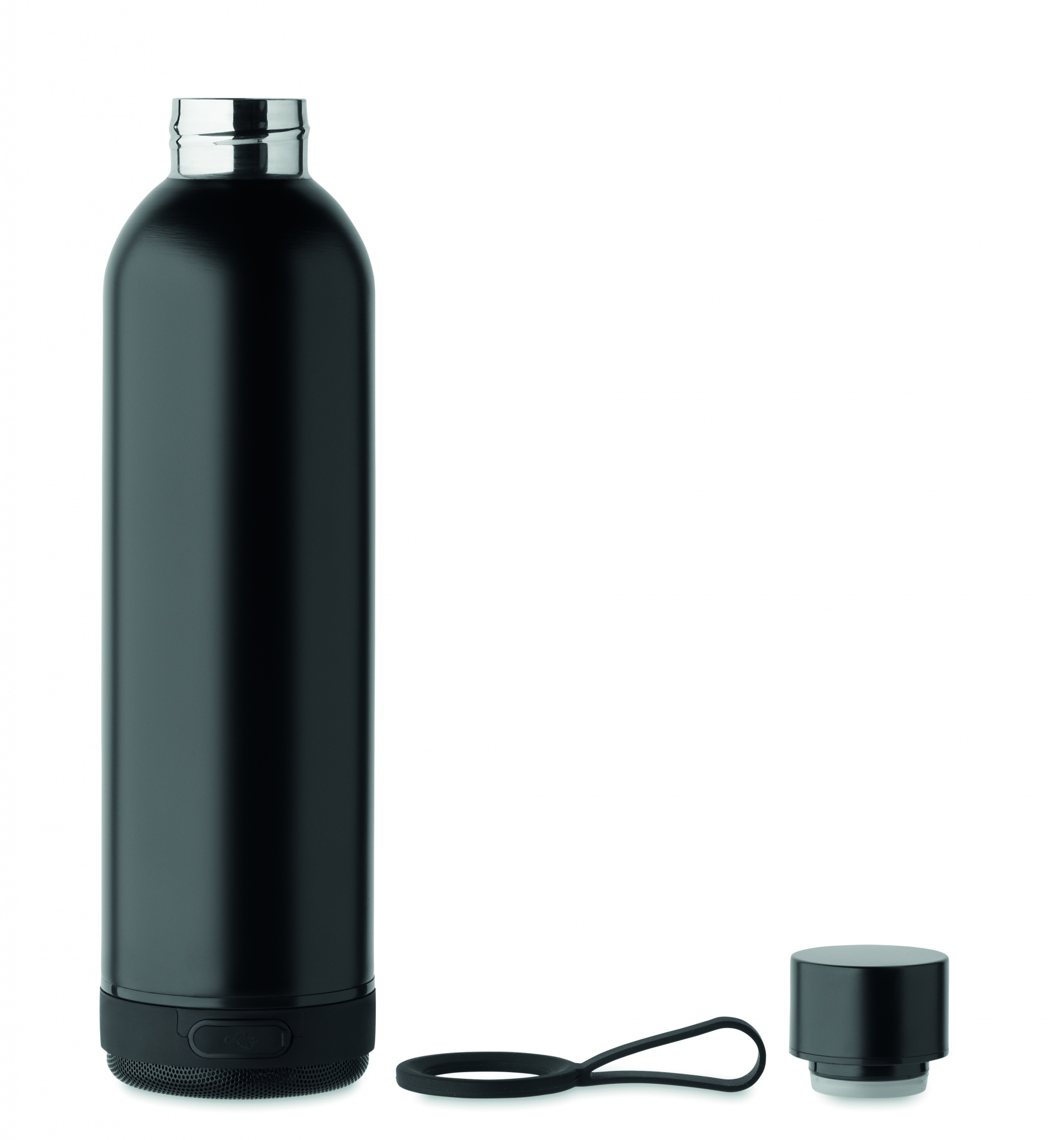Dubbelväggig vakuumisolerande flaska i återvunnet rostfritt stål (90% återvunnet rostfritt stål och 10% rostfritt stål) och silikonbärhandtag med löstagbar 3W trådlös högtalare. Volym: 500 ml. 500 mAh batteri. Ta bort högtalaren vid rengöring. Läckagefri.