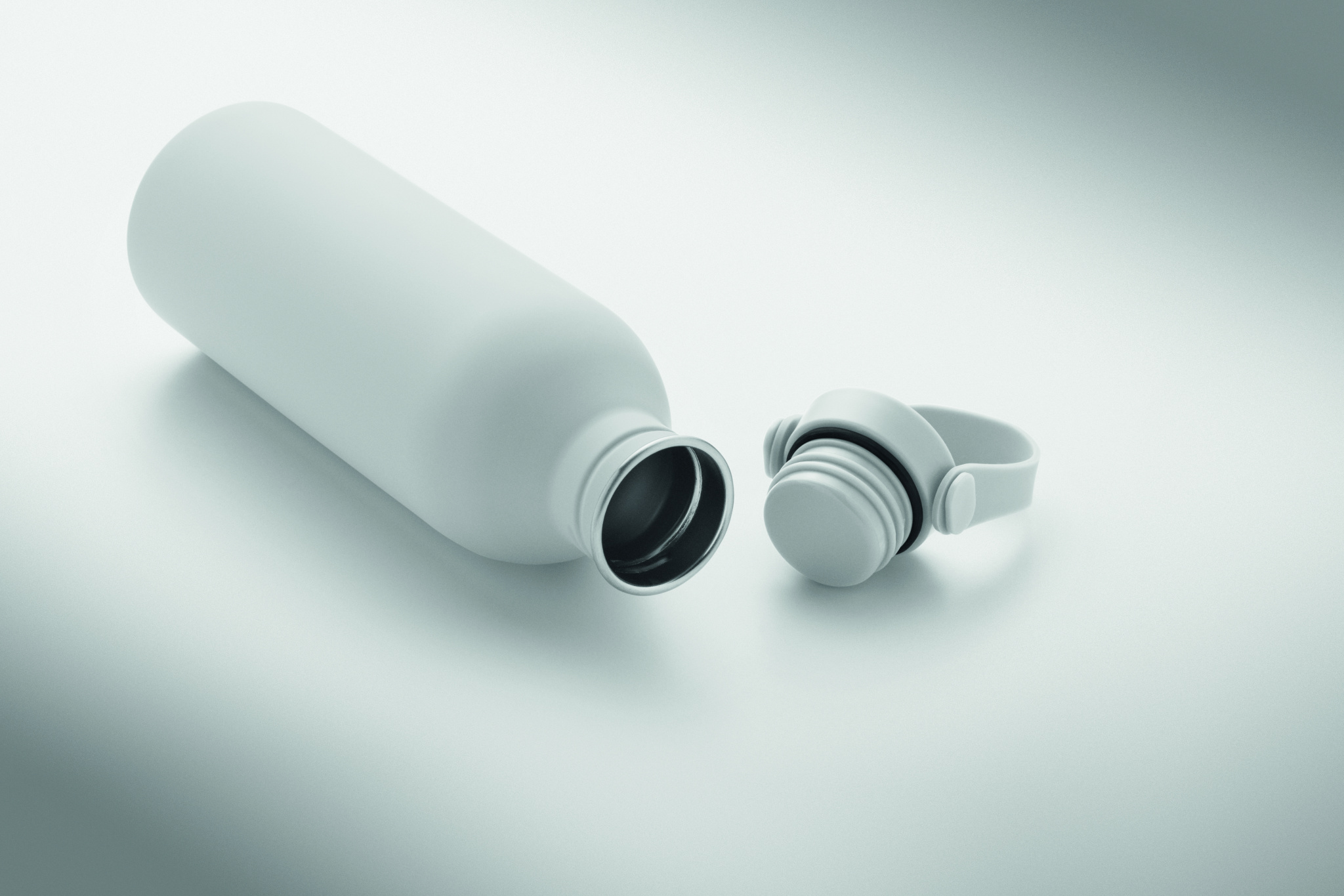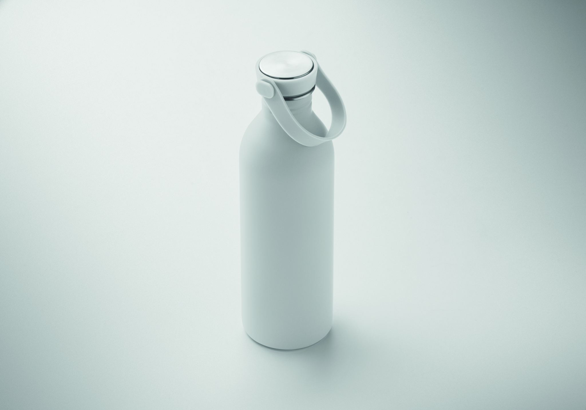 Enkelväggig flaska tillverkad av 90% återvunnet rostfritt stål och 10% rostfritt stål med gummifinish. Inklusive lock i PP och SS med silikonhandtag. Volym: 500 ml.