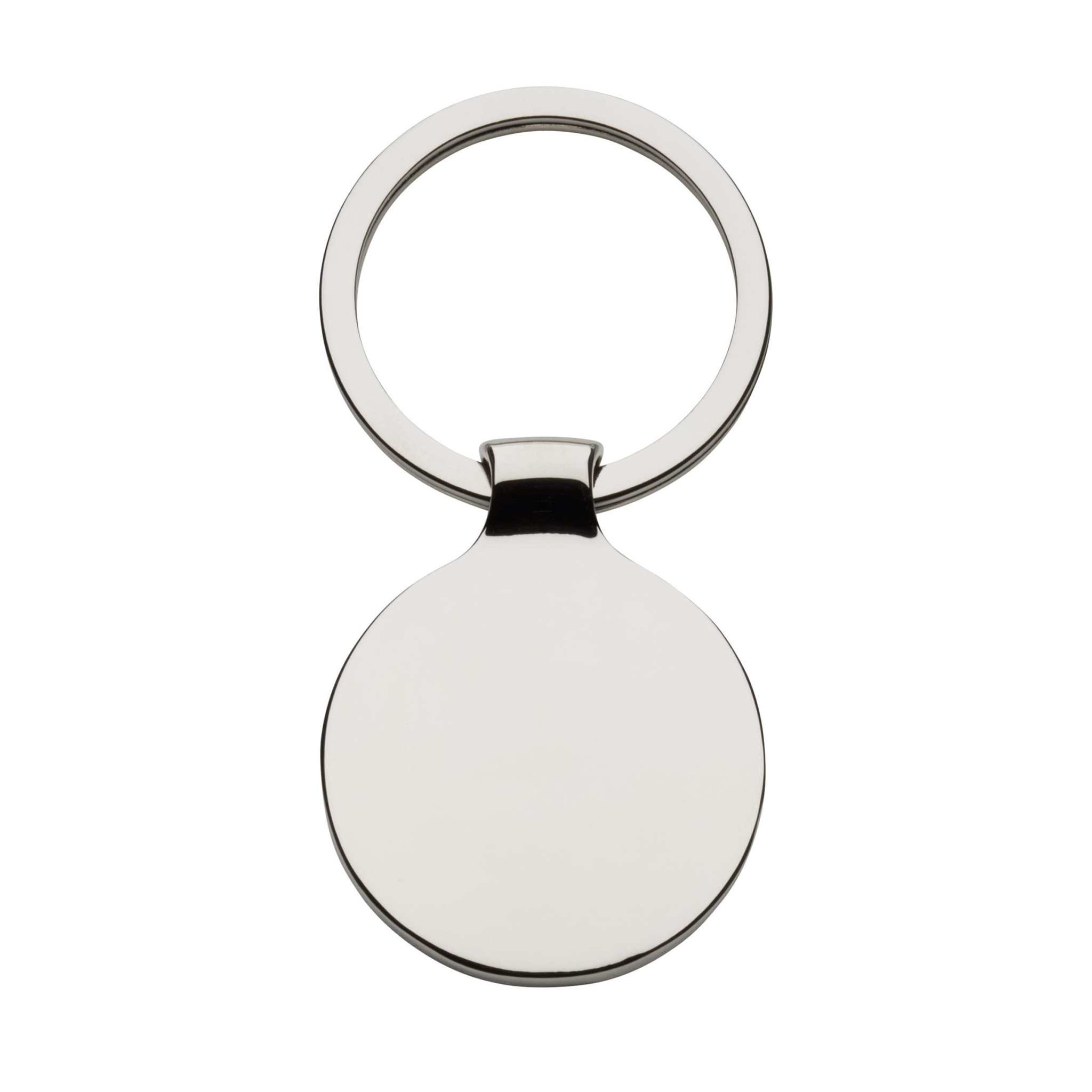 En rund, polerad nyckelring i nickelmetall med svart inlägg och robust nyckelring. Varje artikel levereras i ett individuellt brunt kartongkuvert.