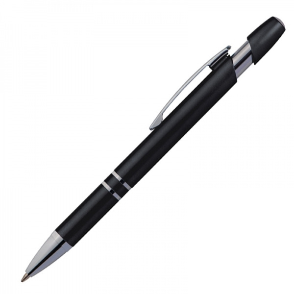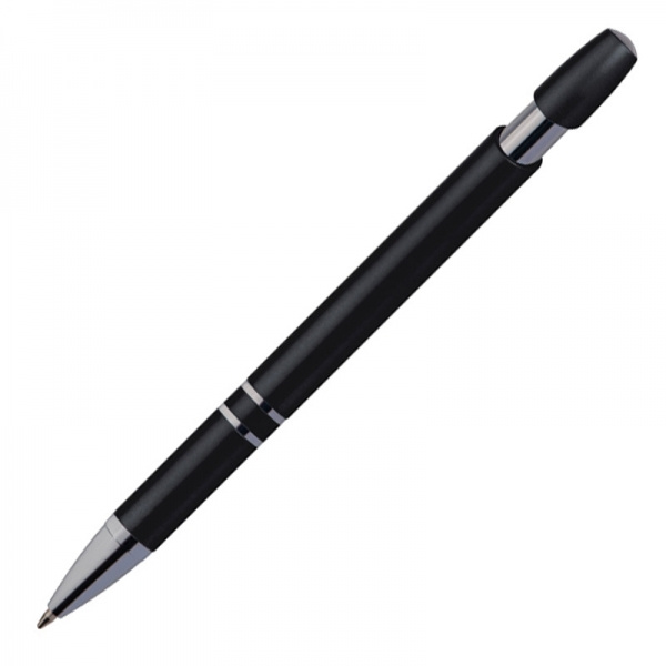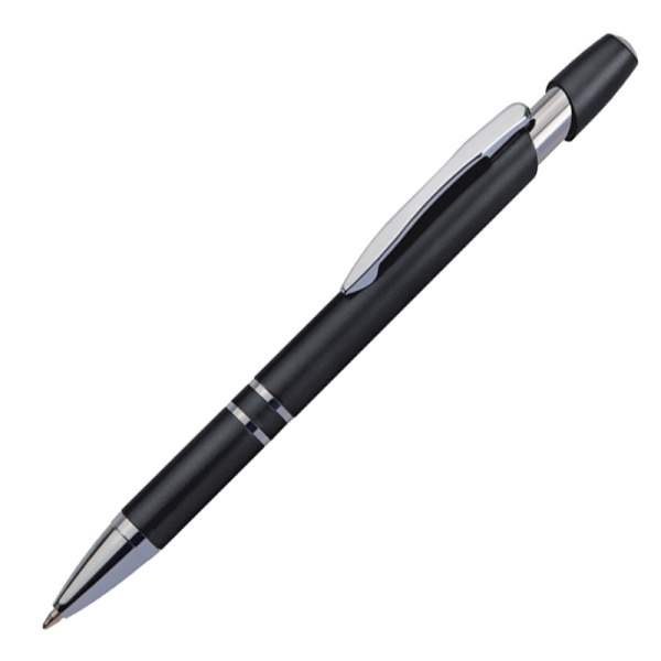 Metallisk kulpenna i plast med stor kapacitet påfyllning och tryckfunktion. Vi kommer att trycka din logotyp under klippet.