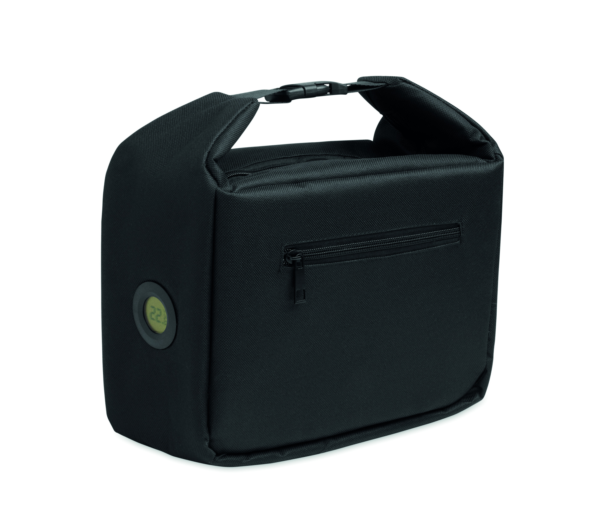 Kylväska med termometer på utsodan insidan, tillverkad av 600D RPET med 3 mm PE-skum och foder av aliminiumfolie. Stängning med spänne. Huvudfack med dragkedja. Med sidoficka med dragkedja. Volym: 10L