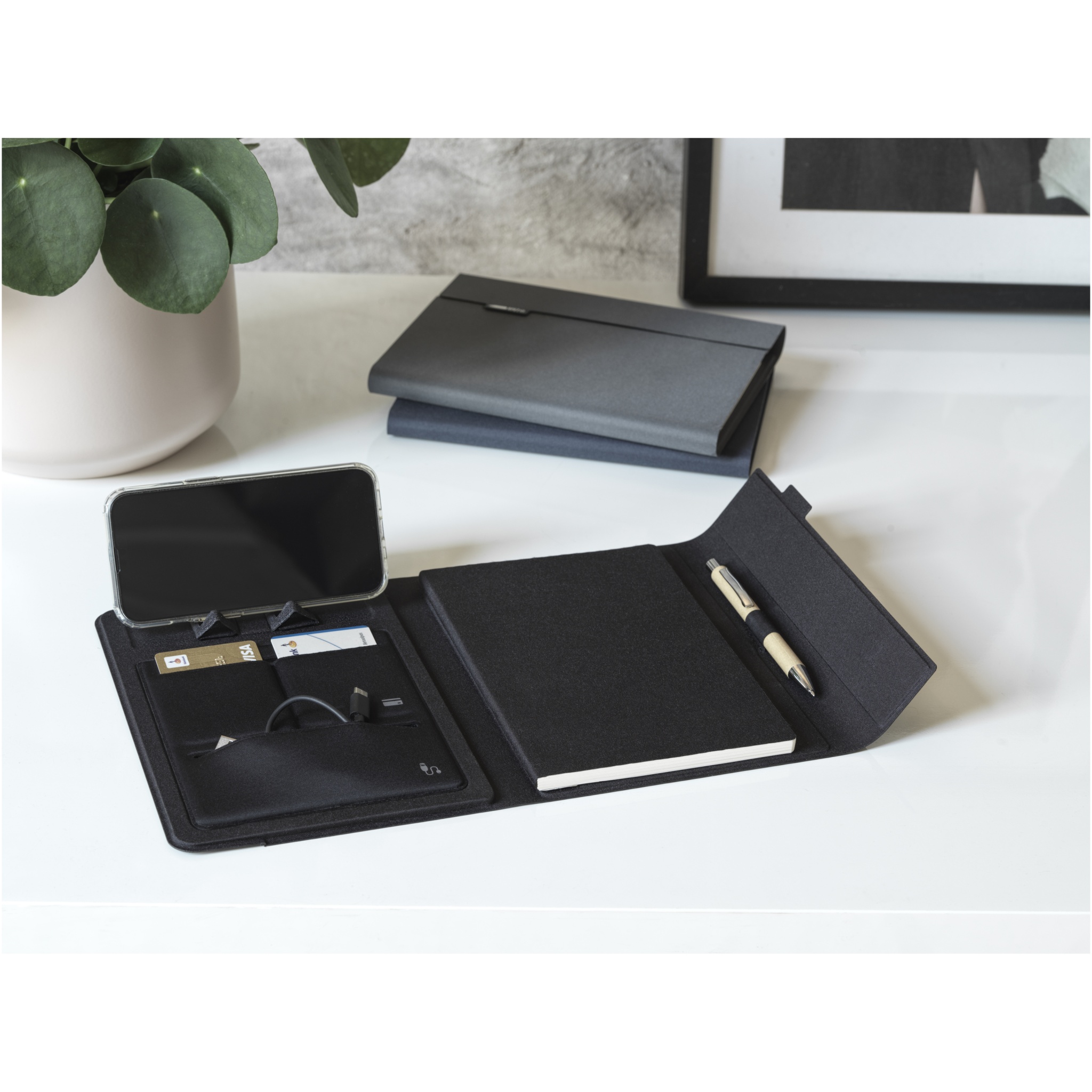 Det RCS-certifierade fodralet Liberto till surfplatta är delvis tillverkat av återvunnen återanvänd polyester, vilket gör det till ett mer hållbart val eftersom det bidrar till att minska användningen av nya råmaterial. Det har pennögla, dragspelsficka och 64 cremefärgade linjerade ark med 80 g/m2 återvunnet papper från hållbara källor. Pennan och andra tillbehör som visas på bilderna ingår inte i denna artikel.