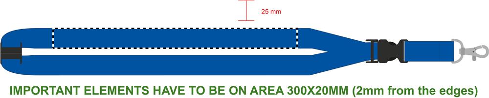 Logoband med metallkrok, avtagbart spänne och säkerhetsspänne i nacken. 25 mm brett. Sublimeringstryck endast på vit produkt.