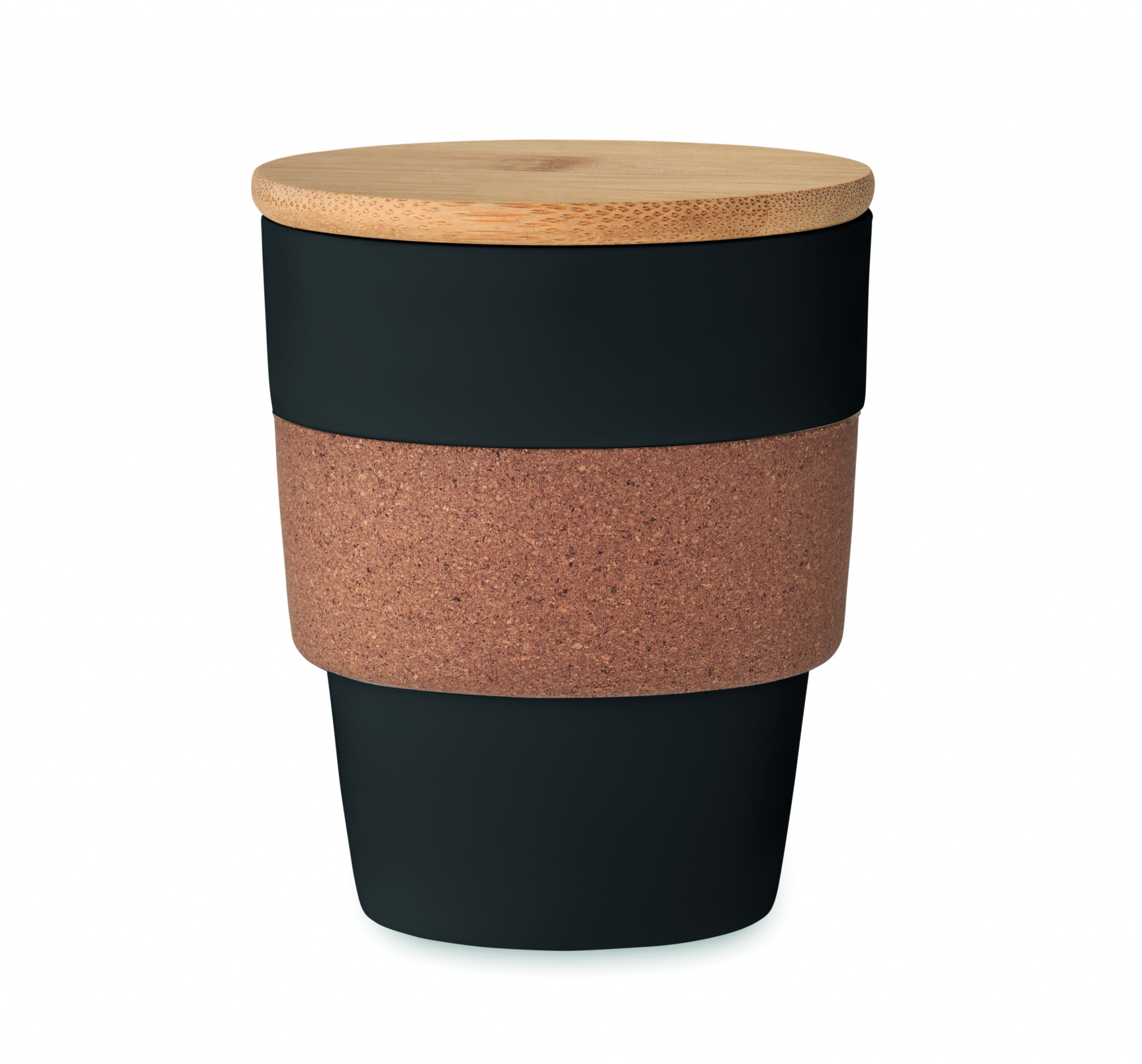 Enkelväggig mugg i återvunnen PP med skyddshylsa av kork och bambulock. Volym: 300 ml. Eftersom detta är en enkelväggig mugg kan värmeöverföring fortfarande förekomma.
