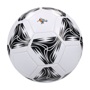 Reklamfotboll med sportig design. Denna fotbollsfotboll i storlek 5 är gjord av en glänsande PVC med 3 lager och 32 maskinsydda paneler. Kulan är 2 mm tjock, med butylgummiventil och latexblåsa. Denna boll levereras platt och kommer att behöva blåsas upp vid leverans.