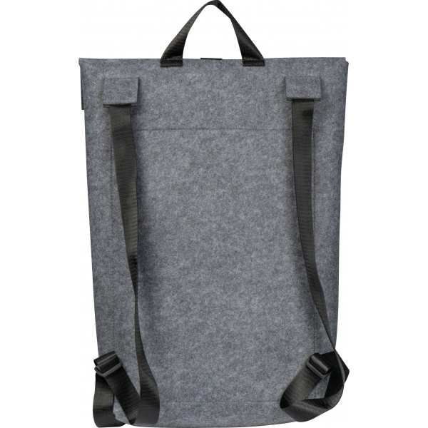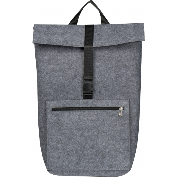 Högkvalitativ ryggsäck gjord av återvunnen filt. Förutom det rymliga innerfacket med justerbar stängning har den ett framfack med dragkedja och justerbara vadderade axelband. Din logotyp kommer att placeras på det främre facket.
