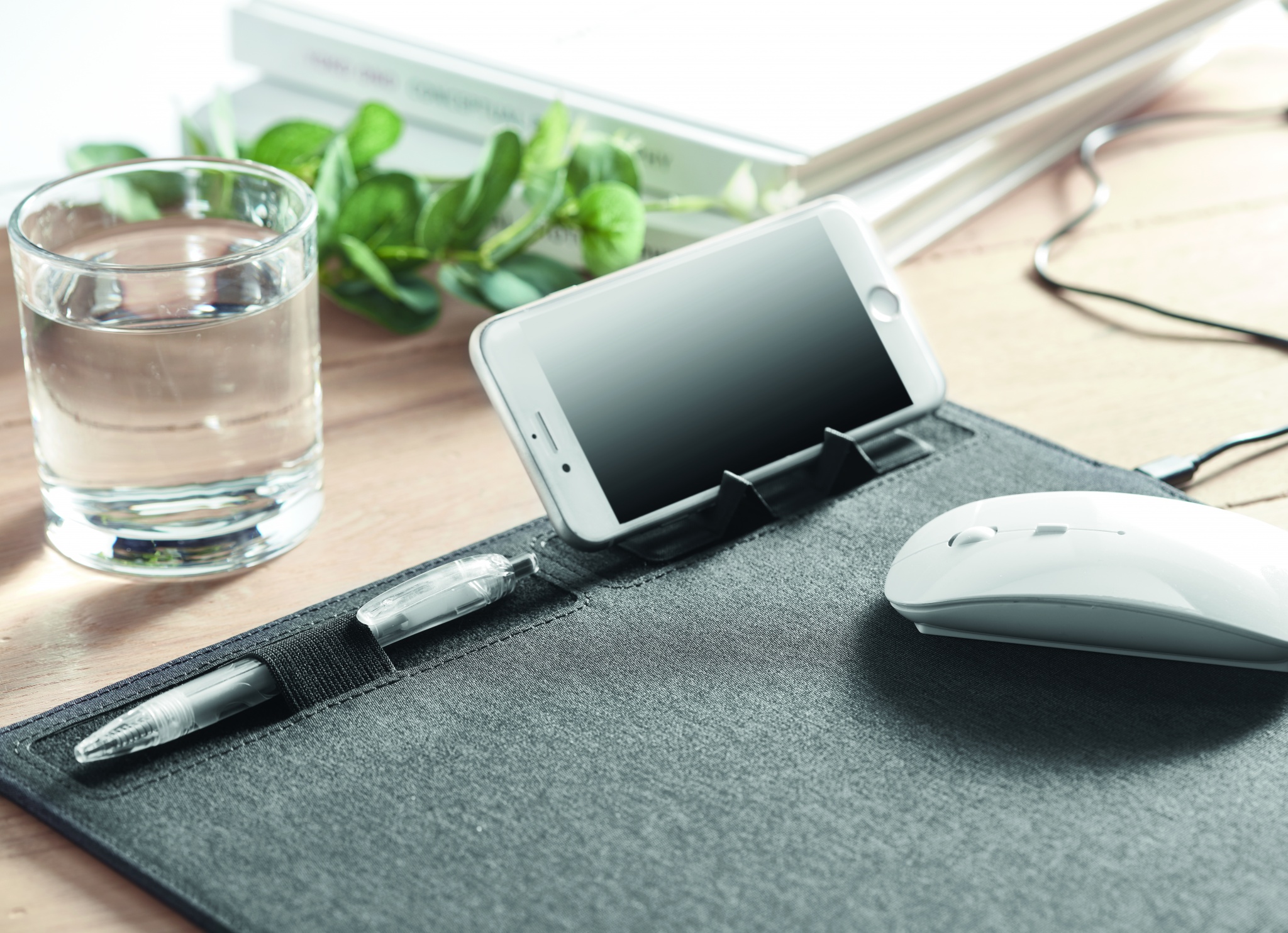 Musmatta med multifunktion. 2-färgad 300D Polyester RPET med 15W trådlös Qi snabbladdare och telefonstativfunktion. Uteffekt: DC 9V/1.6A (15W) för snabbladdning. Kompatibel med senaste Androids, iPhone® 8 och nyare.