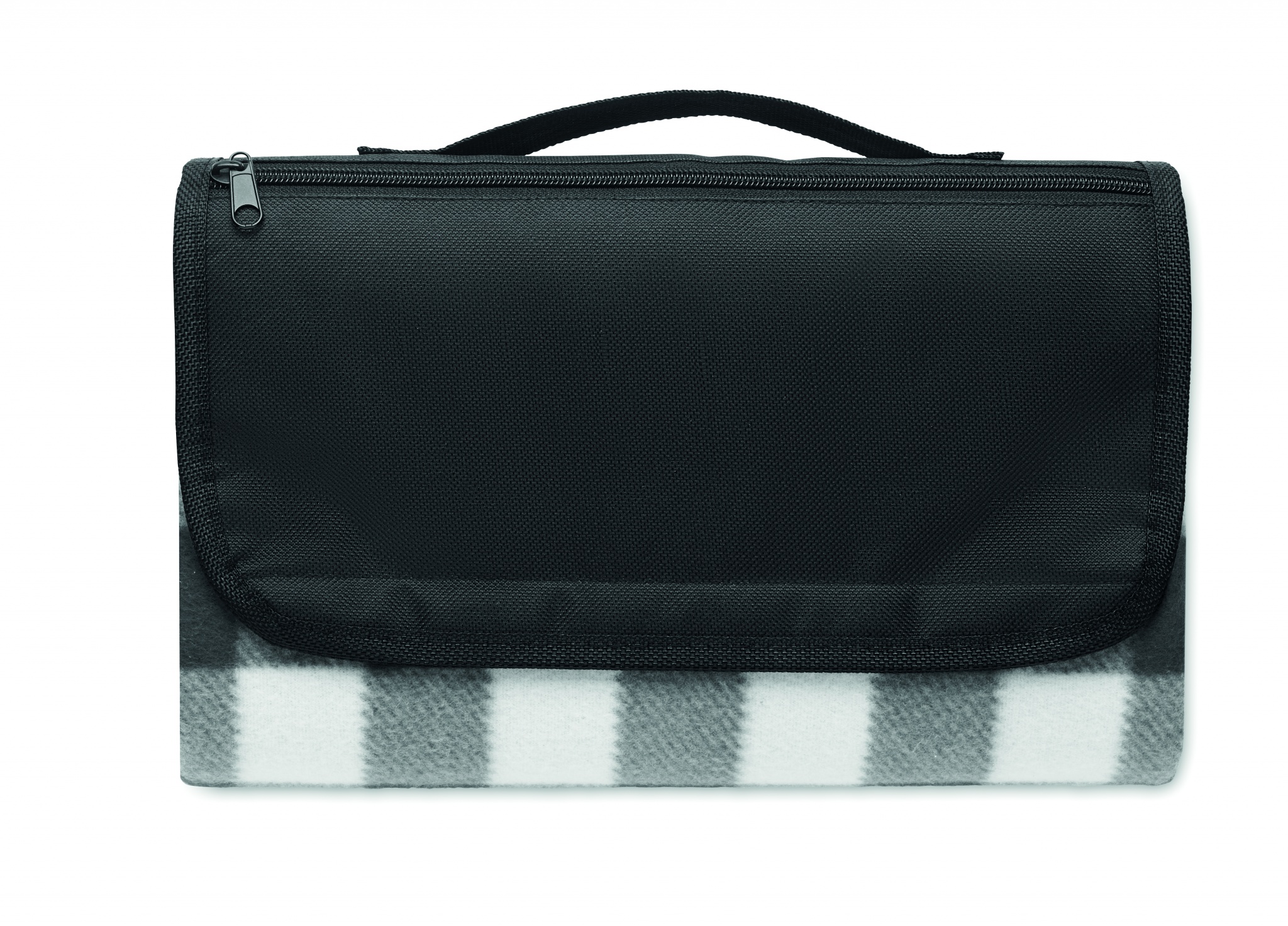 Vikbar RPET 150 gr/m² polarfleece picknickfilt med vattenavvisande belagd PEVA-baksida. Inkluderar en ficka med dragkedja på framsidan och en kort bärrem.