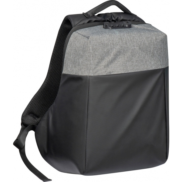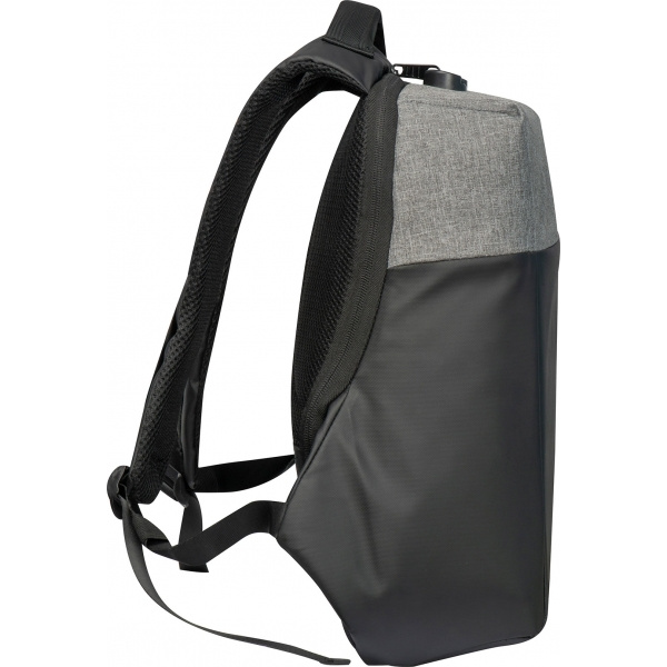 Vagnklar stöldskyddad ryggsäck med hårt skal tillverkad av 600D polyester med extra funktioner: Kombinationslås för huvudfacket, stöldskyddsfack på baksidan, litet dragkedjeförsett fack på den vadderade axelremmen, vadderad ryggpanel, vadderat bärhandtag, laptopfack med framficka och elastiska remmar, en USB-port för anslutning av en powerbank (ingår ej), fyra pennhällor, öppning för hörlurar, tre glidfickor och en avtagbar nyckelring. Med två kardborrestängningar inuti kan ryggsäcken öppnas antingen delvis eller helt. Din logotyp kommer att placeras på framsidan.