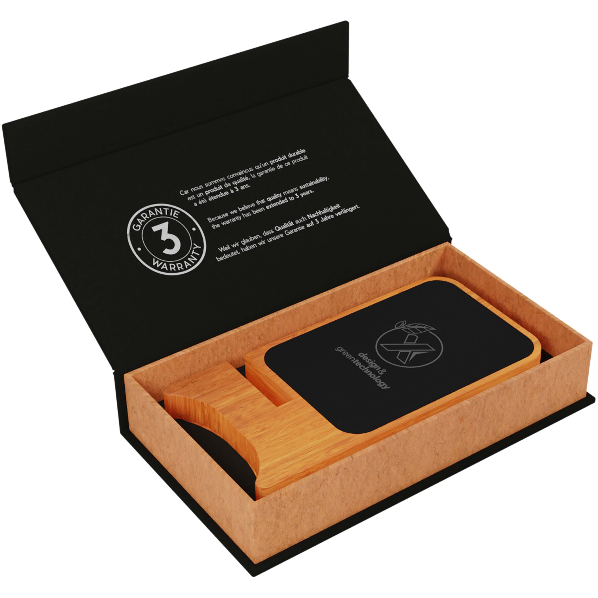 10 W trådlös laddare tillverkad av gummi och bambu med antibakteriell behandling och upplyst logotyp. Typ-C-ingång: Levereras i en svart presentförpackning gjord av återvunnet kraftpapper inklusive kabel i återvunnen PET plast. Patent EUROPE EUIPO.
