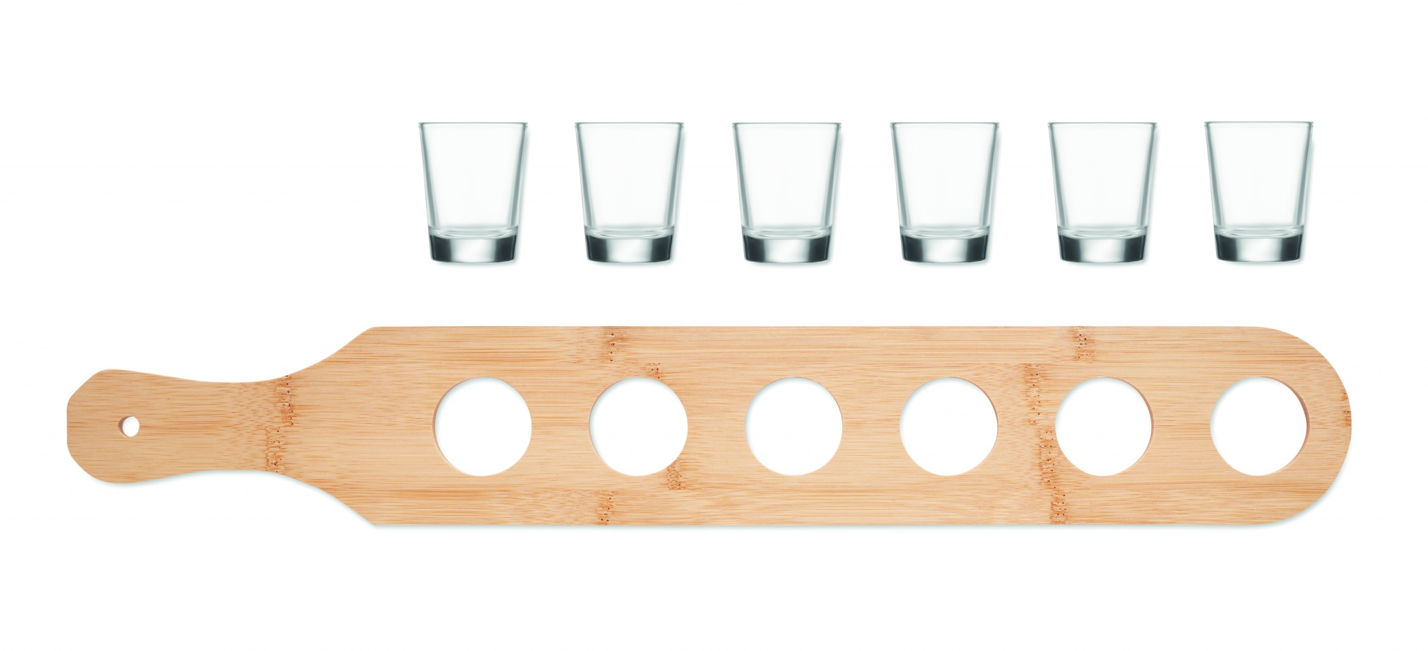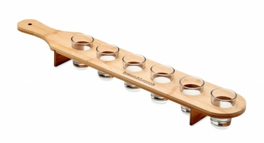 Uppsättning med 6 shotglas på en bambuplatta med handtag. Kapacitet: 20 ml.
