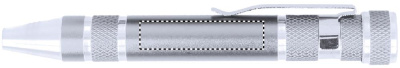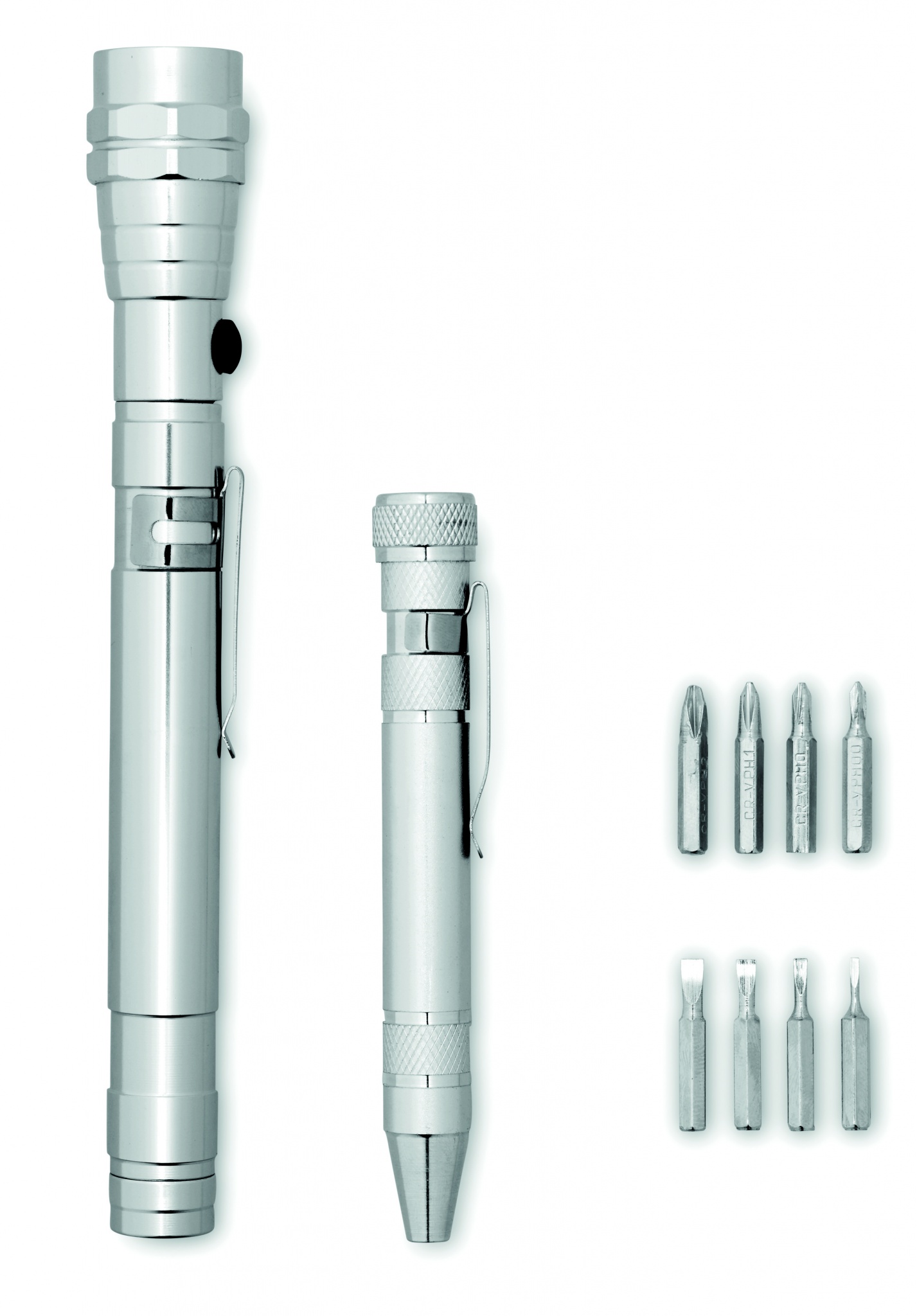 Verktygsset med utdragbar aluminium ficklampa med 3 LED-ljus och aluminium multiverktyg . Inkluderar 4 spår och 4 skruvmejsel huvuden. 4 batterier LR44 ingår. Presenteras i en box.