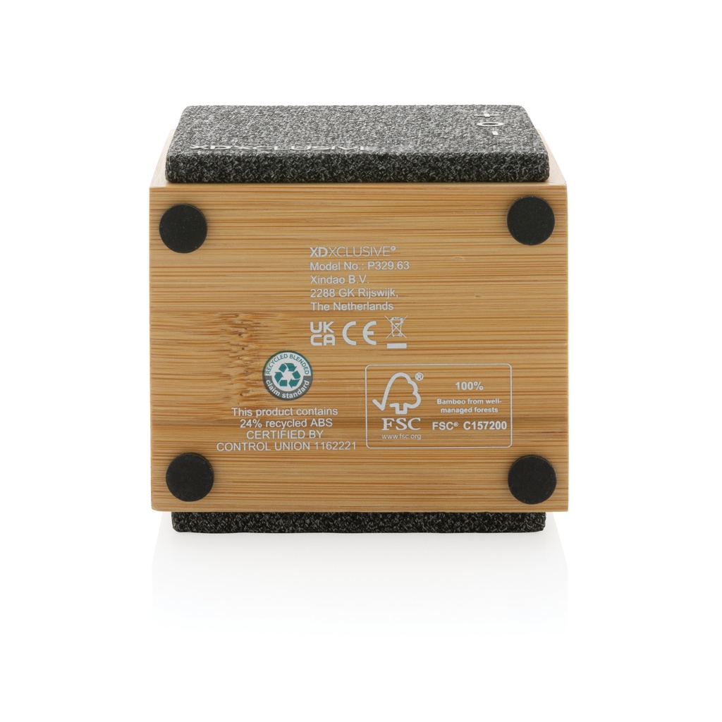 Lyxig 5W högtalare med klart ljud och en stark bas. Högtalaren är tillverkad av FSC 100% bambu. Plastkomponenterna är tillverkade av RCS (Recycled Claim Standard) certifierad återvunnen ABS. Totalt återvunnet innehåll: 24% baserat på total produktvikt. RCS certifiering säkerställer en helt certifierad leveranskedja av de återvunna materialen. Med BT 5.1 för smidig anslutning, upp till 10 meter räckvidd och låg energikonsumption. Batteriet på 1200 mAh ger en speltid på upp till 6 timmar och kan laddas fullt inom 2 timmar. Med mikrofon/svarsfunktion för att besvara inkommande (video)samtal. Levereras i FSC mix kraft förpackning. Laddningskabel i RCS certifierad TPE medföljer.